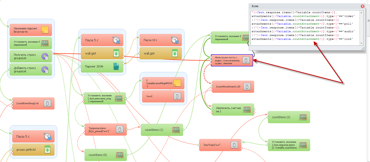 2. Фильтруем посты по вхождению подстроки в текст поста в кубике показанном на скрине.