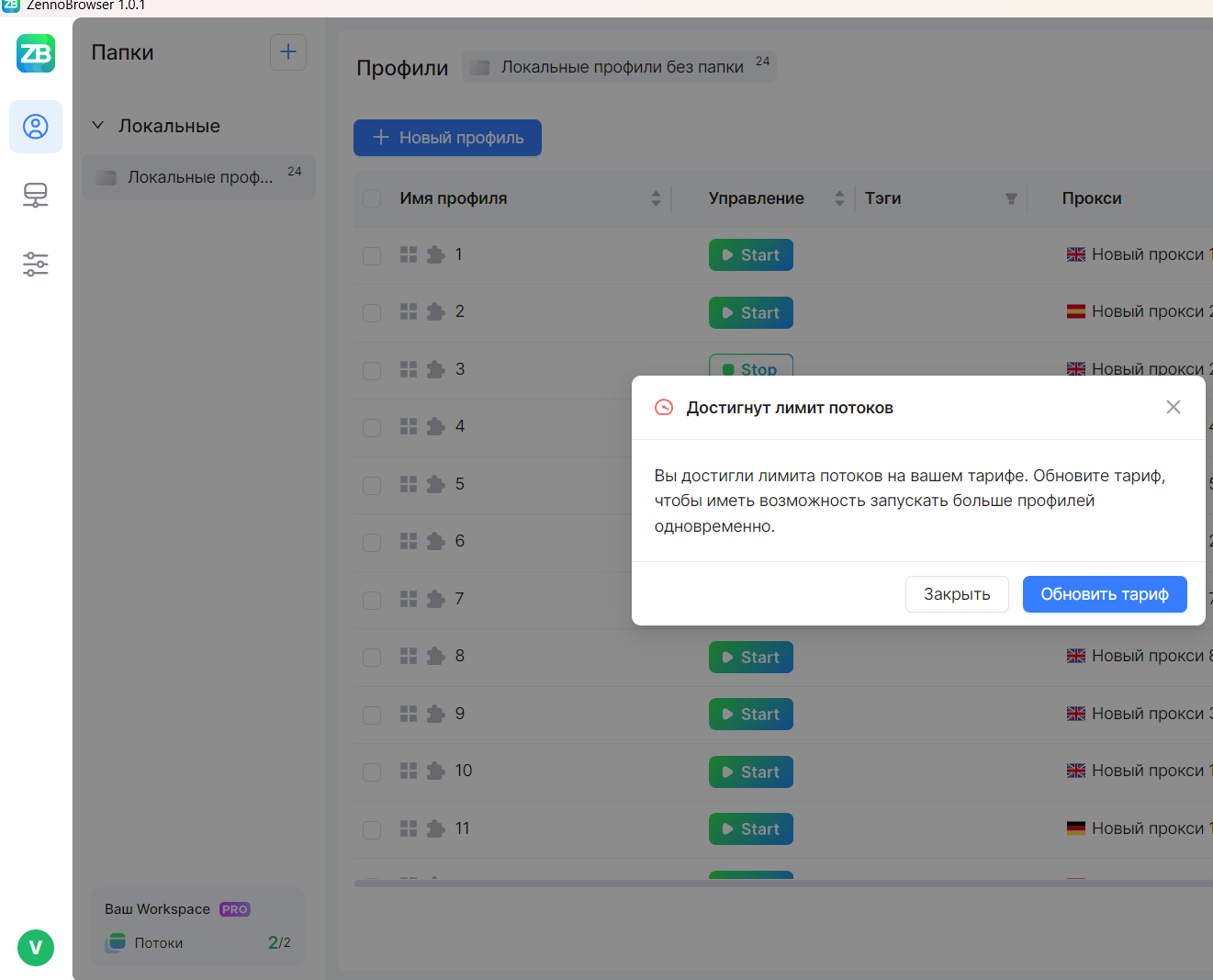Добрый день. Второй день подряд, после полуночи (по МСК), перестает работать второй поток. После открытия первого потока, система не дает открыть второй поток и просит сменить тариф! Перезагрузка ПК и ноутбука, не помогает. На скриншоте видно, что система показывает, что открыто 2 потока, но это фикция - открыт, только один поток. Через несколько часов, сбой исчезает, но время уже потеряно. Что делать дальше?