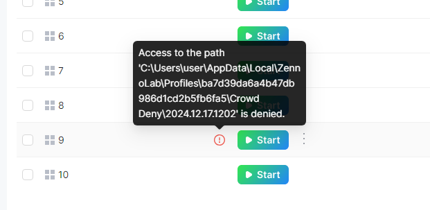 Выполнение действия Запустить инстанс ZennoBrowser Ошибка запуска профиля ZennoBrowser (3E835A70-C577-4A02-B293-BB8183037D07): Access to the path 'C:\Users\user\AppData\Local\ZennoLab\Profiles\ba7d39da6a4b47db986d1cd2b5fb6fa5\Crowd Deny\2024.12.17.1202' is denied.