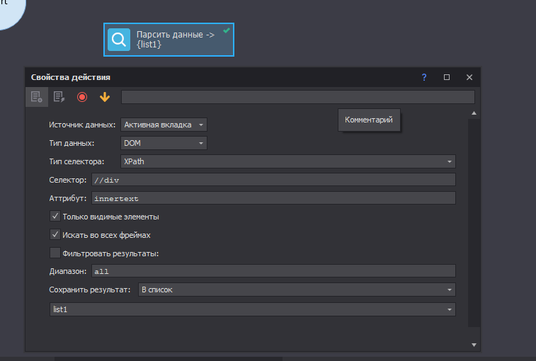 через кубик парсингНаписал запрос http://joxi.ru/823P8dQc8aEYWA Выбираю экшн "Обработка текста". Далее {-Page.Dom-}. Далее во вкладке "Выбрать действия" пытаюсь найти Xpath, но такой опции нет. Как сохранить результаты парсинга в файл?