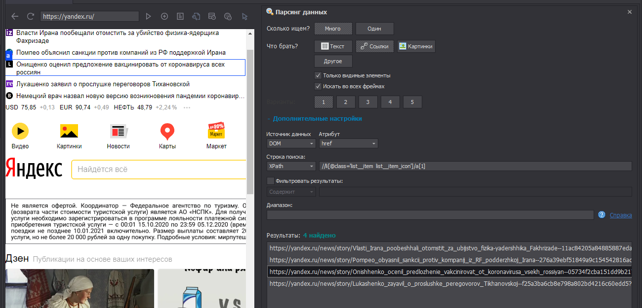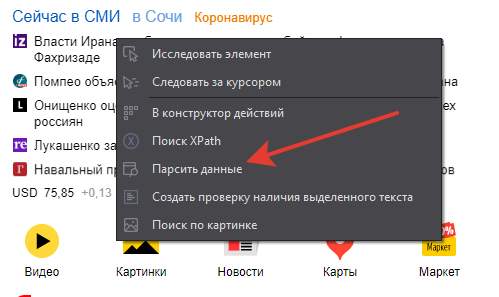 есть же действие - парсить данные по правой кнопке, там есть расширенная настройка и можно поставить свой xpath там же увидишь результат. ну и там есть возможность сразу в список это пихать.Очень нужно, хелп!