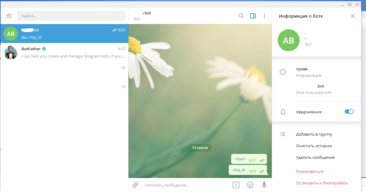 что-то никак не могу понять как ID чата с ботом получить, он что-то собака не идет со мной на контакт