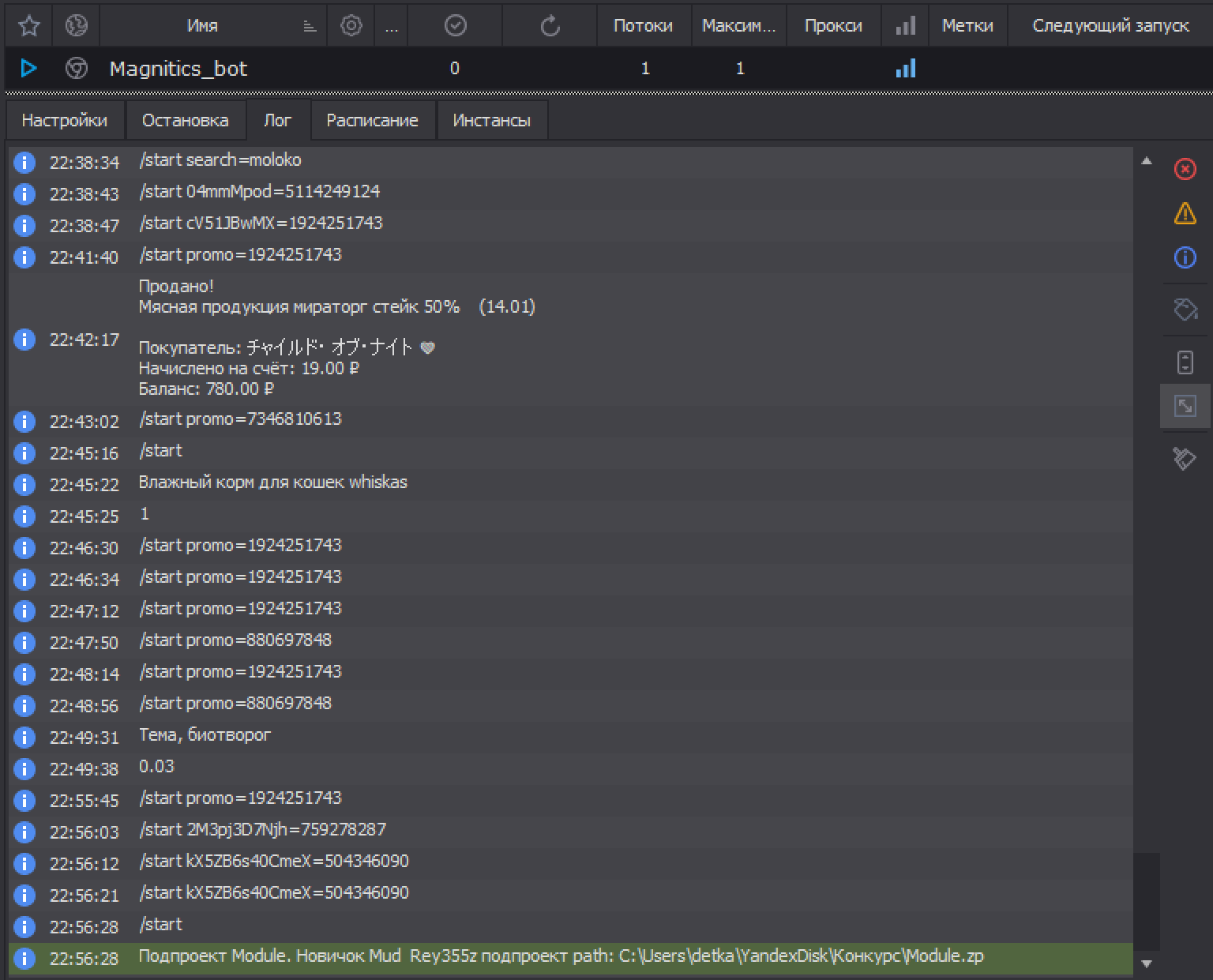 Идея шаблона следующая: он получает апдейты Телеграм и пропускает каждый результат через подпроект (Module), где логику обработки вы составляете сами и можете заниматься её разработкой на ходу. Просто открываете шаблон подпроекта (Module) в ProjectMaker и работаете с ним, периодически делая сохранения по мере необходимости. В качестве отладки можно ставить уведомления в местах, где вы проводите работы, чтобы видеть в Логе ZennoPoster, как обрабатываются данные.