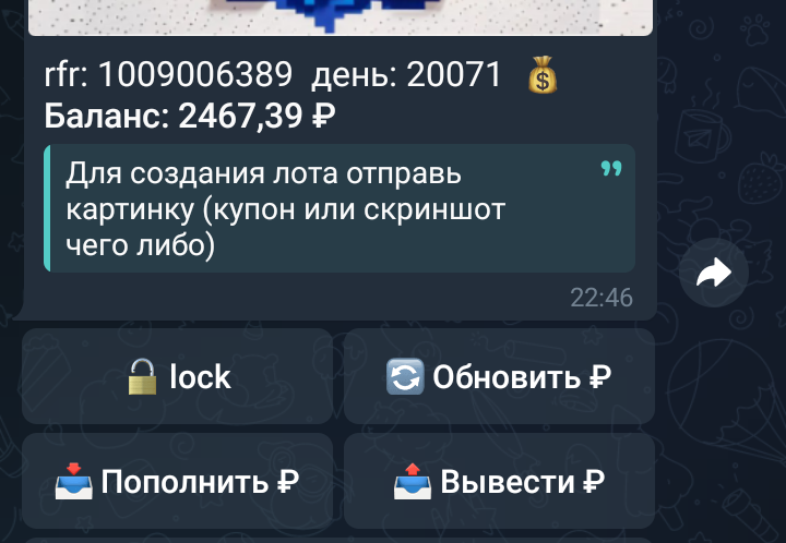 В ближайшее время я приступлю к добавлению еще одной ветки для обработки обновлений, где Телеграм сообщает о выборе пользователем определенного inline-результата - чтобы сохранять идентификаторы inline-сообщений и дальше обновлять все публикации одного лота их по мере изменения его данных.