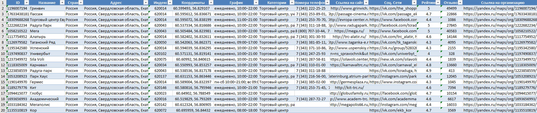Пример итоговой таблицы по запросу "торговый центр", по региону "Екатеринбург":