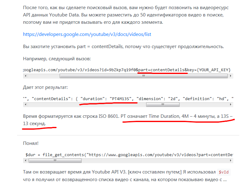 4. Смотрим статью с названием "Youtube API v3, как получить длительность видео?"