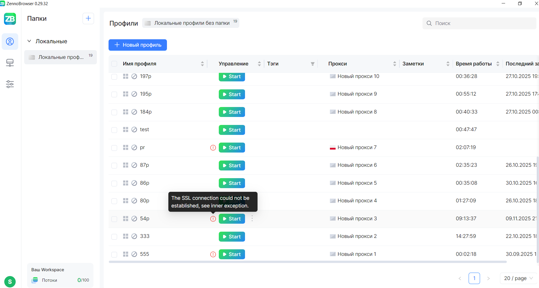Не запускается ни один профиль, прокси рабочие, пробовал запускать профиль без прокси, тоже не работает.