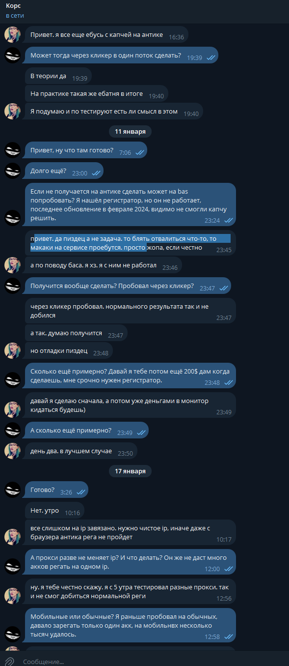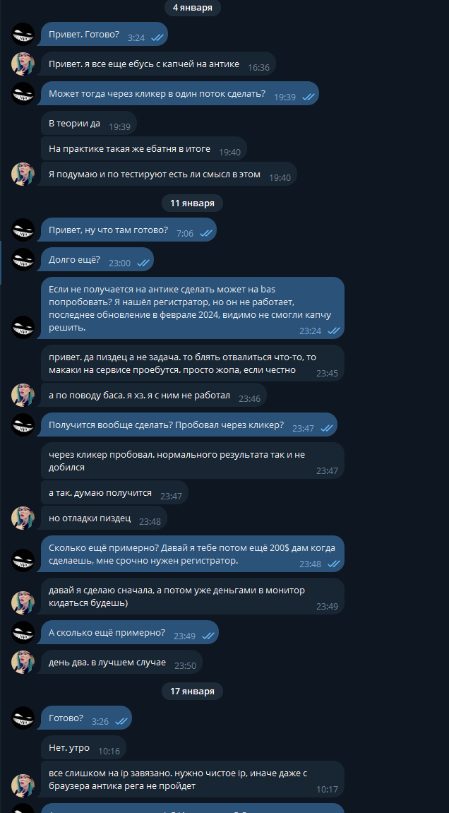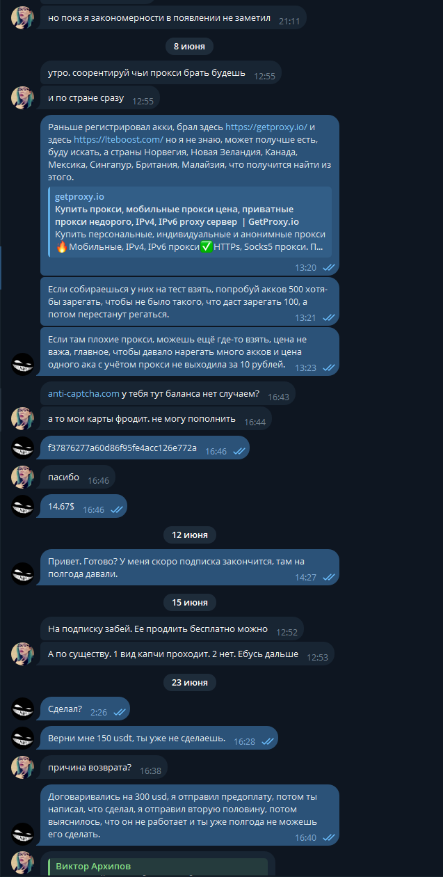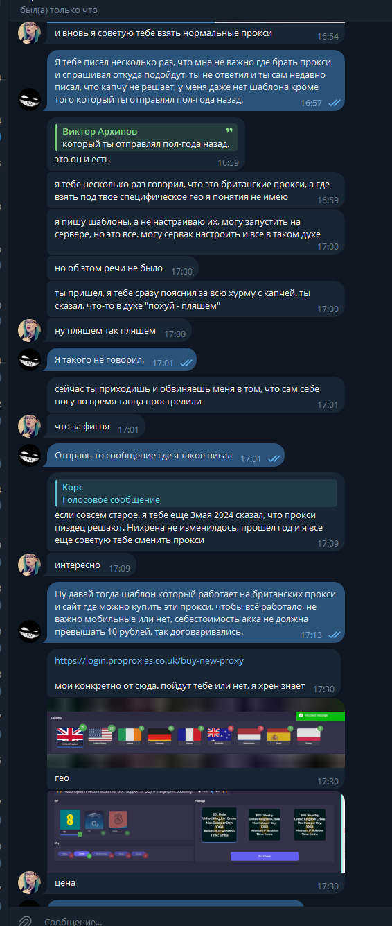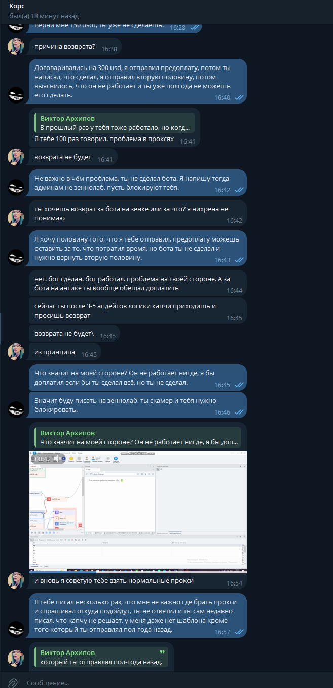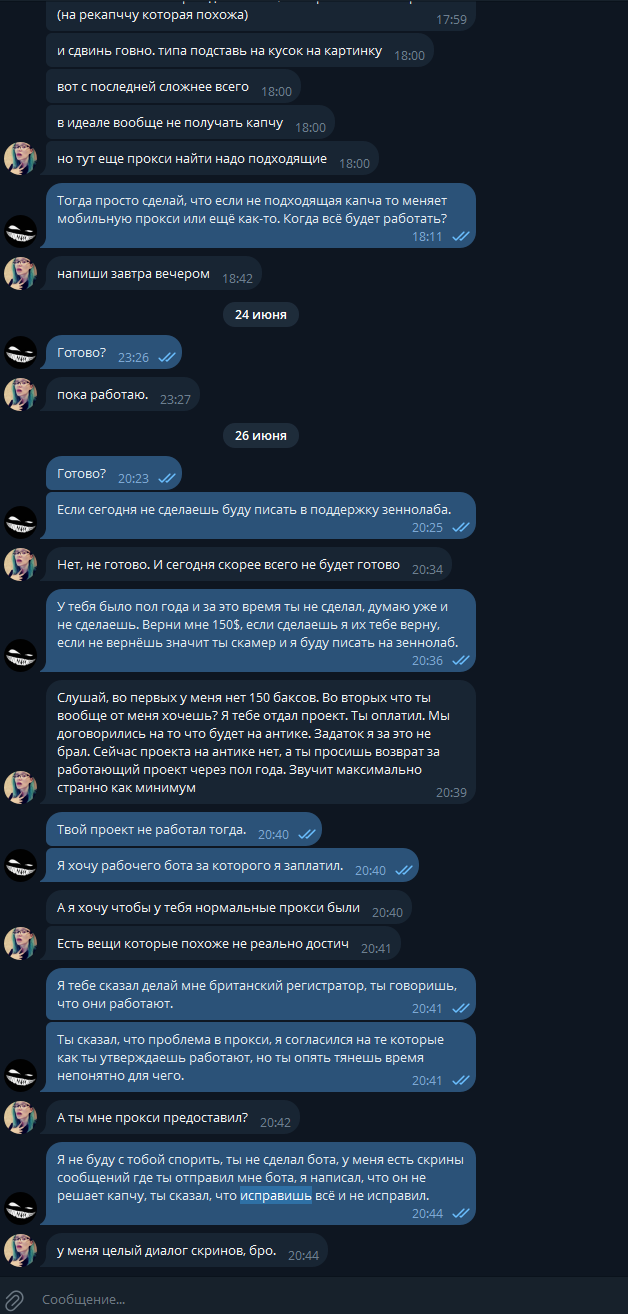 Про антик это он предложил, а доплатить за это я не предлагал, я просто предложил докинуть 200$ чтобы он быстрее доделал, на скринах которые прикрепил к этому сообщению можно это увидеть по дате сообщений можно понять, мне без разницы на чём был бы регистратор, главное, чтобы работал. До того как написать сюда предложил ему вернуть мне половину того, что заплатил до того как не сделает, это видно на скрине корс9, он отказался. Про прокси - я дал ему мобильную прокси в самом начале за 50 или 60$, он не смог с неё чсделать, это уже 360$ на шаблоя я потратил, он сказал, что прокси нужно искать прося у всех на тест, но какой смысл мне брать прокси на тест часа на 2, а потом передавать ему? У него были свои какие-то прокси и он не смог с них добиться работы или я должен был купить ещё прокси за 60$ после того как он не смог сделать на первой? Потом он нашёл способ регать и зарегал 100 акков, но теперь у него сломалась капча на антике, по факту нормального, рабочего шаблона никогда за эти пол года не было и никто не выполняет заказы по пол года попутно беря новые заказы здесь. Я предоставил скрины, рабочего шаблона никогда не было, на последних трёх скринах видно, что рабочих прокси если проблема была в них у него не было, а когда появились сломалась капча в антике. Соскамил в том, что рабочий шаблон так и не был предоставлен, я дал 300$, дал прокси за 60$, предлагал ещё 200 и получил пол года переносов, отказ вернуть деньги и предложение ждать ещё не понятно сколько, но если за пол года не был сделан шаблон то уже и не будет.