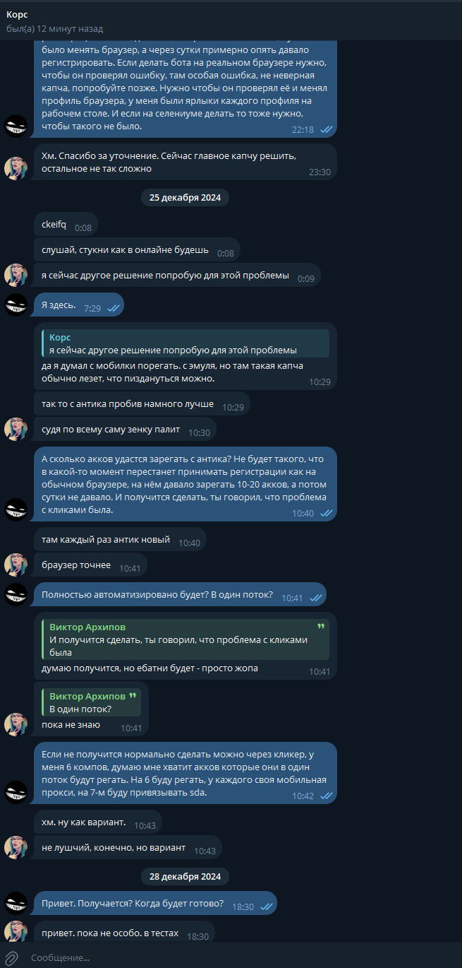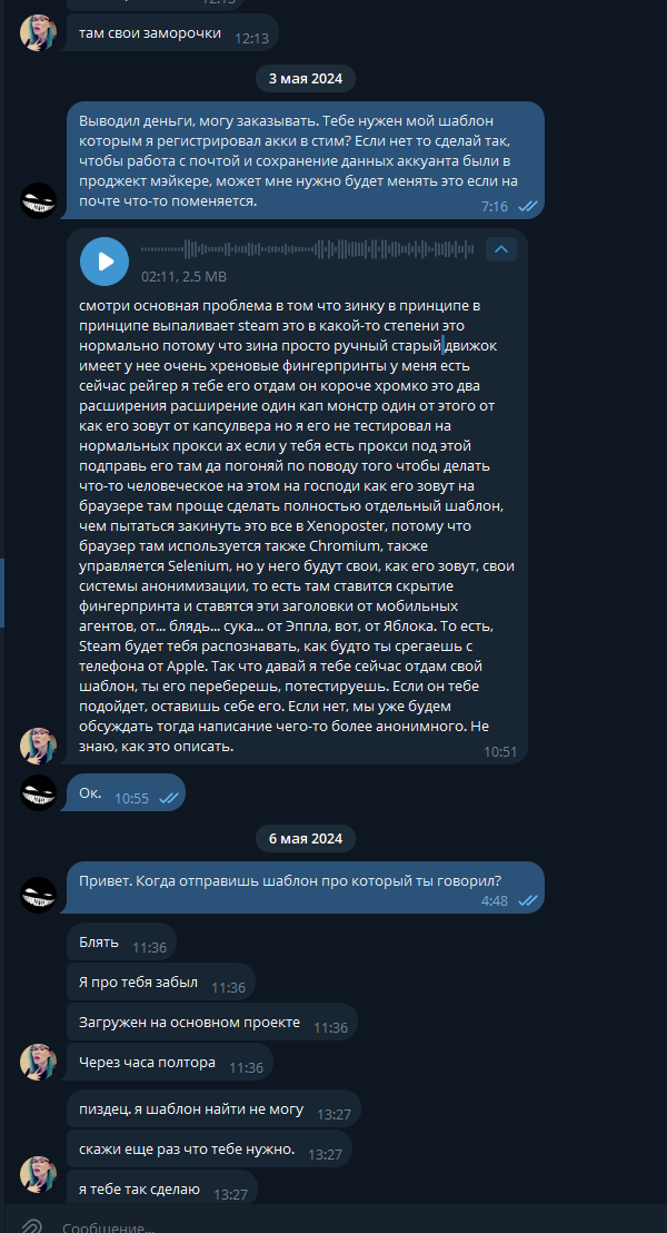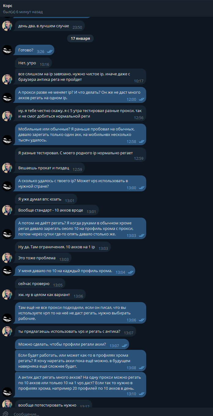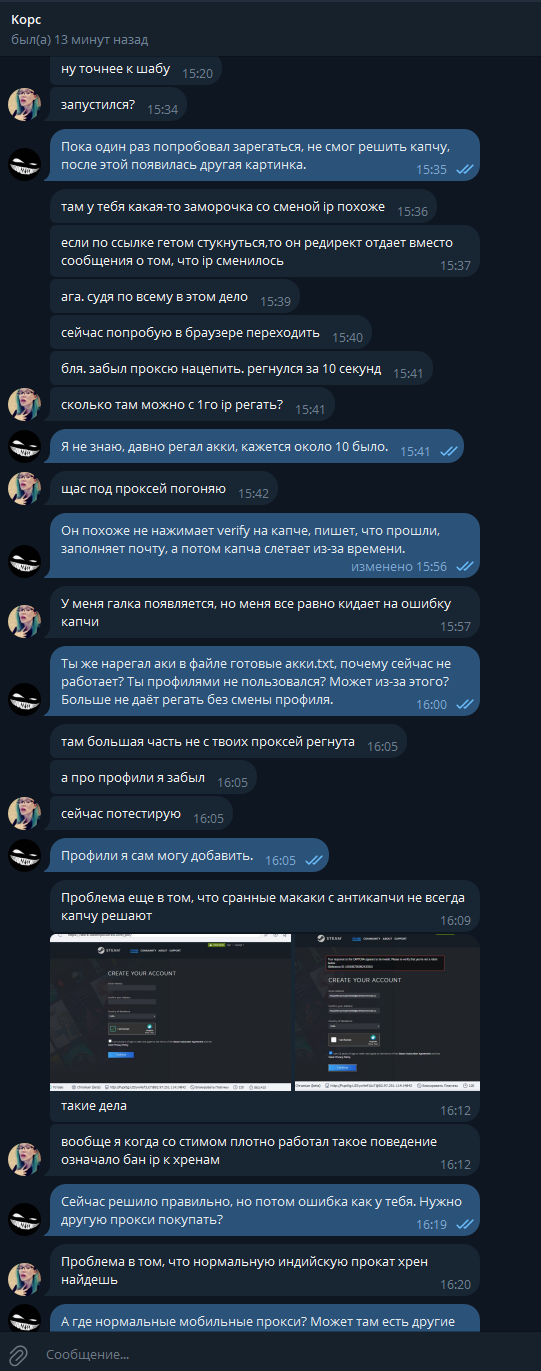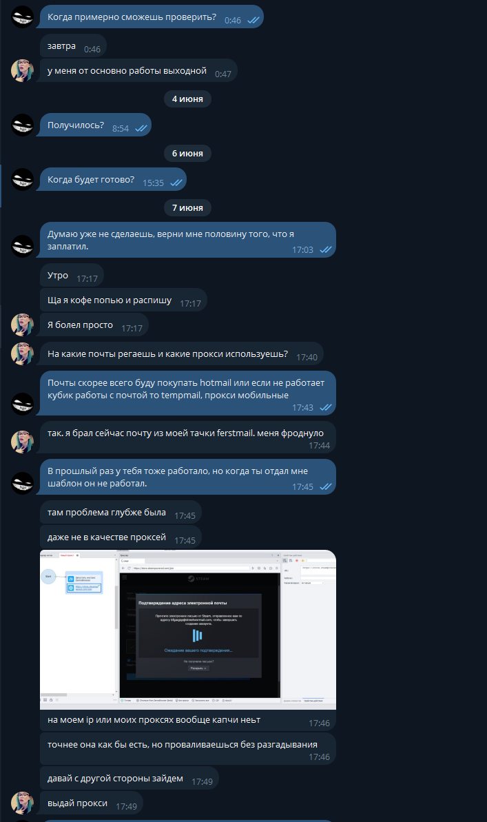 Про антик это он предложил, а доплатить за это я не предлагал, я просто предложил докинуть 200$ чтобы он быстрее доделал, на скринах которые прикрепил к этому сообщению можно это увидеть по дате сообщений можно понять, мне без разницы на чём был бы регистратор, главное, чтобы работал. До того как написать сюда предложил ему вернуть мне половину того, что заплатил до того как не сделает, это видно на скрине корс9, он отказался. Про прокси - я дал ему мобильную прокси в самом начале за 50 или 60$, он не смог с неё чсделать, это уже 360$ на шаблоя я потратил, он сказал, что прокси нужно искать прося у всех на тест, но какой смысл мне брать прокси на тест часа на 2, а потом передавать ему? У него были свои какие-то прокси и он не смог с них добиться работы или я должен был купить ещё прокси за 60$ после того как он не смог сделать на первой? Потом он нашёл способ регать и зарегал 100 акков, но теперь у него сломалась капча на антике, по факту нормального, рабочего шаблона никогда за эти пол года не было и никто не выполняет заказы по пол года попутно беря новые заказы здесь. Я предоставил скрины, рабочего шаблона никогда не было, на последних трёх скринах видно, что рабочих прокси если проблема была в них у него не было, а когда появились сломалась капча в антике. Соскамил в том, что рабочий шаблон так и не был предоставлен, я дал 300$, дал прокси за 60$, предлагал ещё 200 и получил пол года переносов, отказ вернуть деньги и предложение ждать ещё не понятно сколько, но если за пол года не был сделан шаблон то уже и не будет.