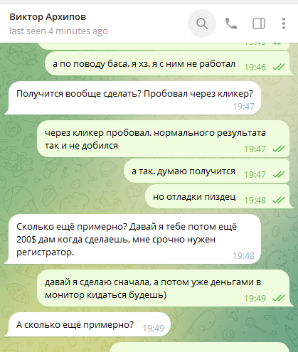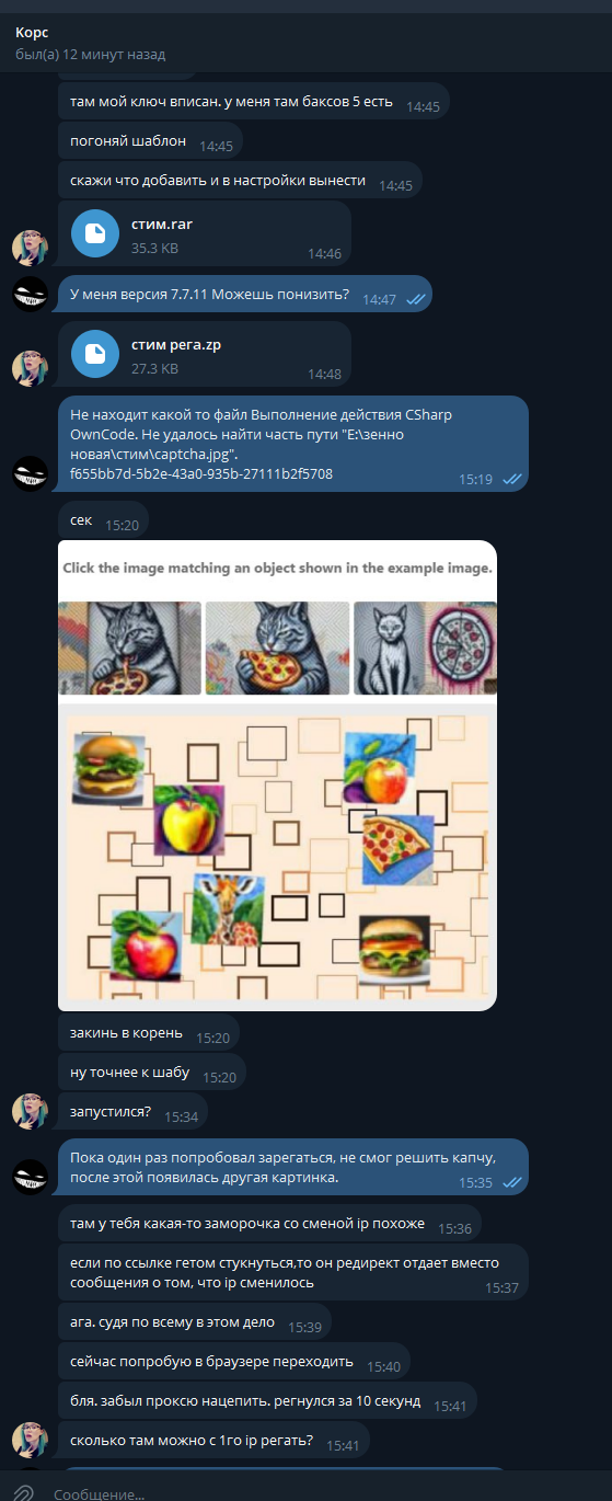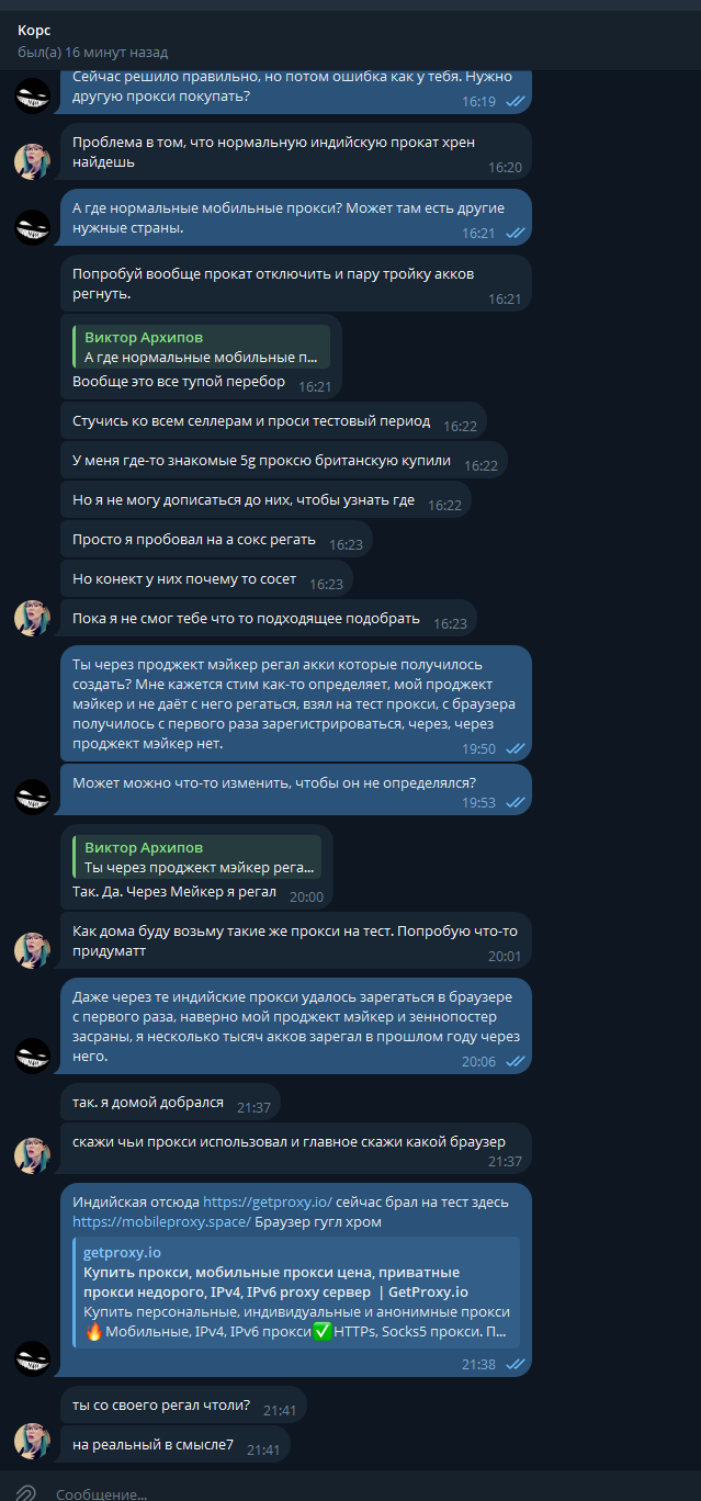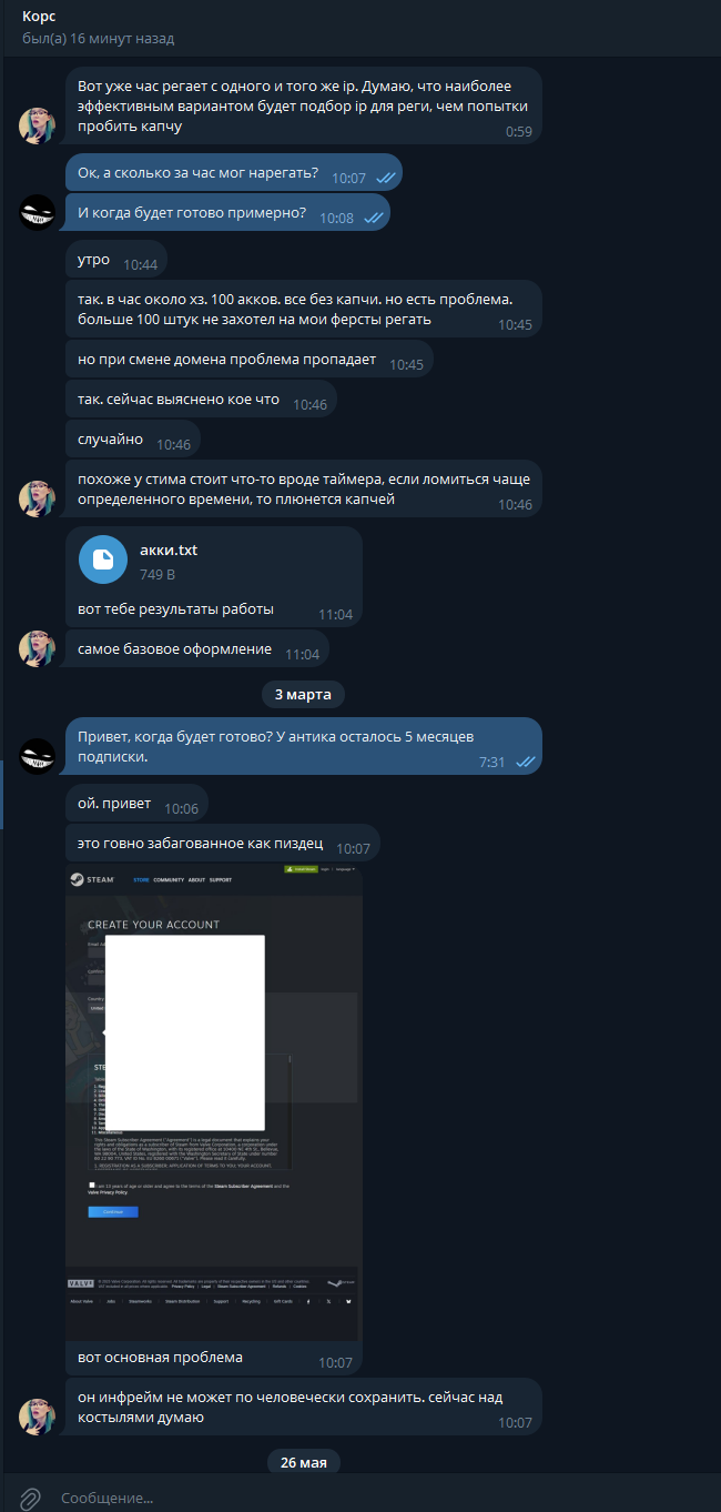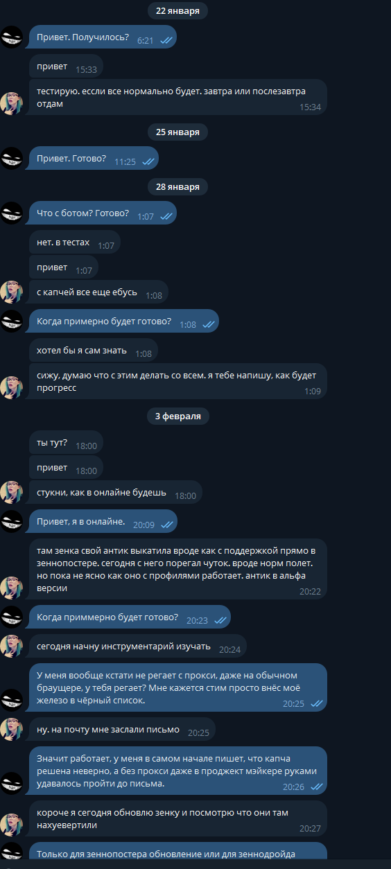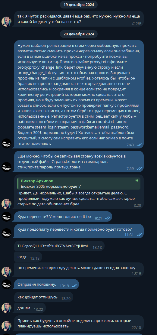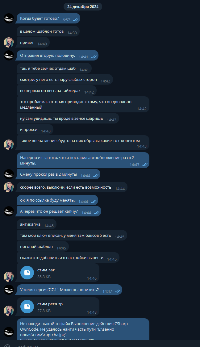 Про антик это он предложил, а доплатить за это я не предлагал, я просто предложил докинуть 200$ чтобы он быстрее доделал, на скринах которые прикрепил к этому сообщению можно это увидеть по дате сообщений можно понять, мне без разницы на чём был бы регистратор, главное, чтобы работал. До того как написать сюда предложил ему вернуть мне половину того, что заплатил до того как не сделает, это видно на скрине корс9, он отказался. Про прокси - я дал ему мобильную прокси в самом начале за 50 или 60$, он не смог с неё чсделать, это уже 360$ на шаблоя я потратил, он сказал, что прокси нужно искать прося у всех на тест, но какой смысл мне брать прокси на тест часа на 2, а потом передавать ему? У него были свои какие-то прокси и он не смог с них добиться работы или я должен был купить ещё прокси за 60$ после того как он не смог сделать на первой? Потом он нашёл способ регать и зарегал 100 акков, но теперь у него сломалась капча на антике, по факту нормального, рабочего шаблона никогда за эти пол года не было и никто не выполняет заказы по пол года попутно беря новые заказы здесь. Я предоставил скрины, рабочего шаблона никогда не было, на последних трёх скринах видно, что рабочих прокси если проблема была в них у него не было, а когда появились сломалась капча в антике. Соскамил в том, что рабочий шаблон так и не был предоставлен, я дал 300$, дал прокси за 60$, предлагал ещё 200 и получил пол года переносов, отказ вернуть деньги и предложение ждать ещё не понятно сколько, но если за пол года не был сделан шаблон то уже и не будет.