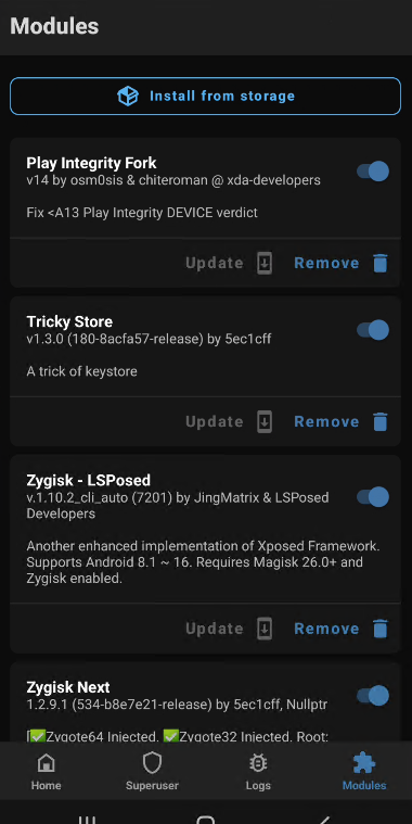 Android 14 samsung, есть варианты пройти проверку на целостность системы? У меня пока не вышло. Модули на скрине. При этом раскладе галочка только device.