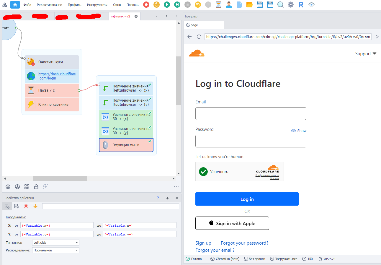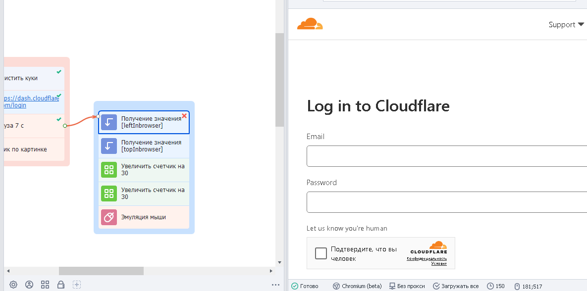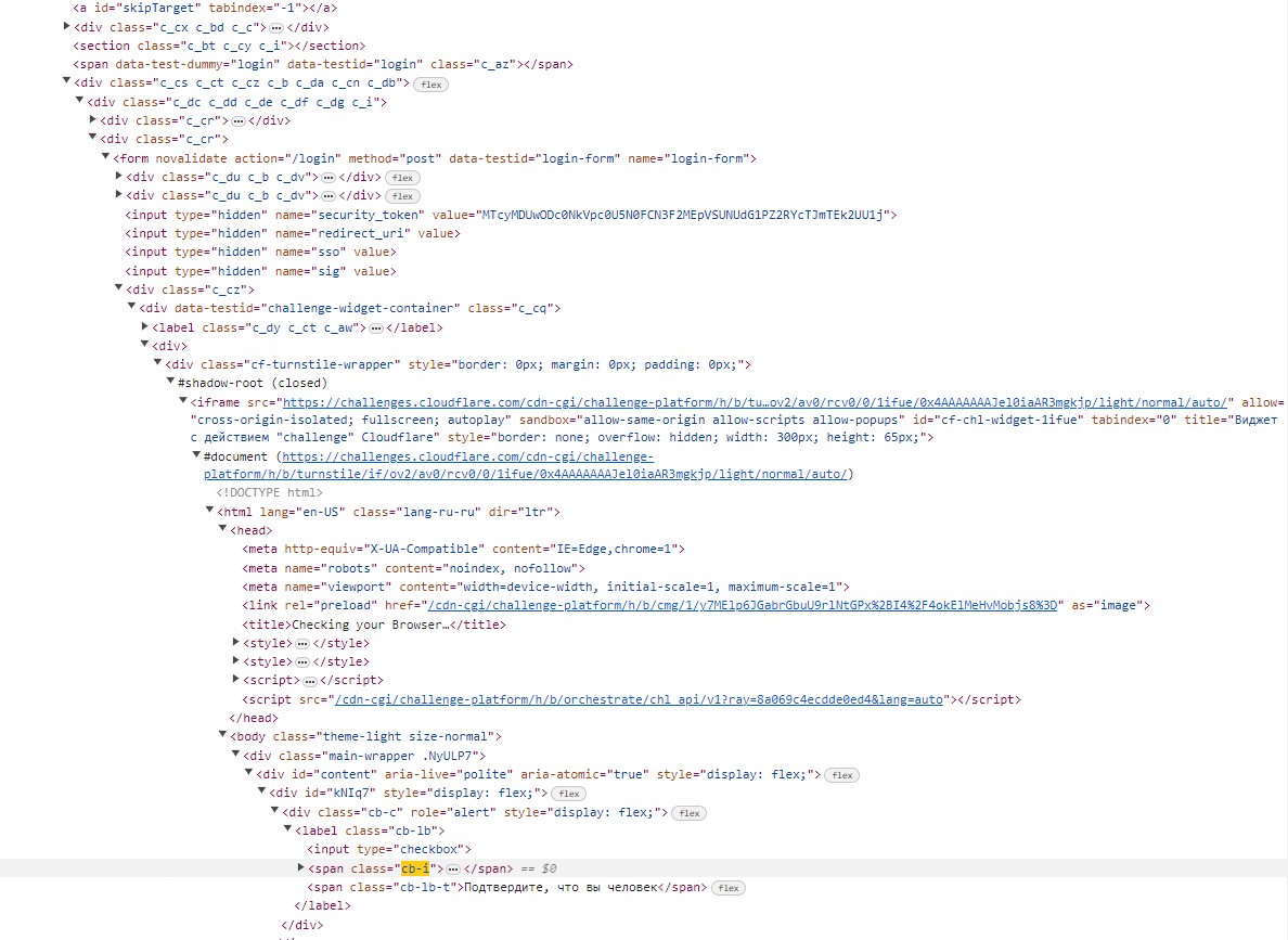 Здравствуйте. Продолжаю бороться с капчей cloudflare. Для этого Логинюсь на самом сайте https://dash.cloudflare.com/login. Еслли раньше, чтобы галочку поставить можно было сделать стандартную кнопку в zenoposter. То сейчас cloudflare закрыли её #shadow-root. И стандартными инструментами нажать не получается. Пытался использовать JS код, написанный ChatGPT: