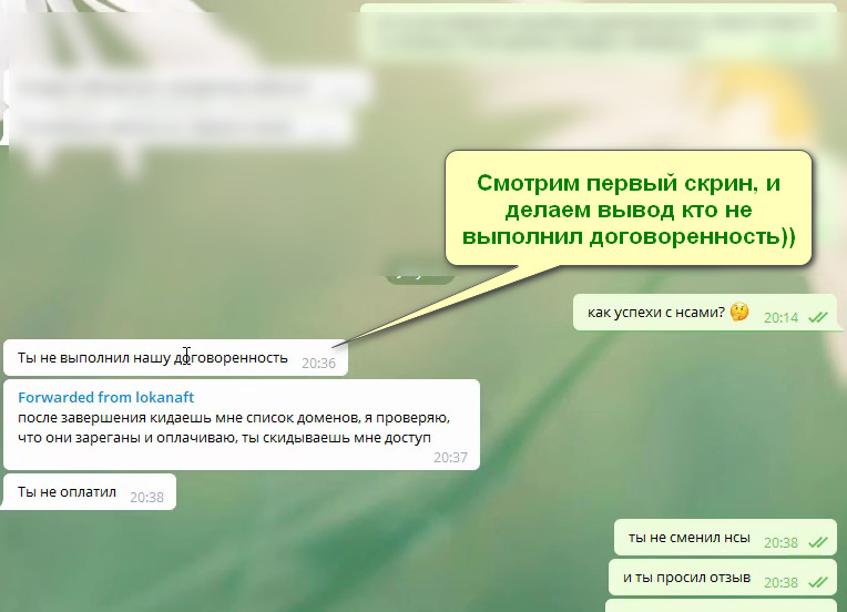 4.0. Допустим исполнитель не захотел после оплаты выдавать домены, но вероятность такого мала так как: он уже их зарегистрировал, в чем заказчик убедился после проверки по Whois, и толкнуть «именные» («мертвый груз») другому покупателю будет труднее, их ценник упадет, тем более после того как заказчик отпишется в топике что исполнитель кидала, и модератор приостановит топик.