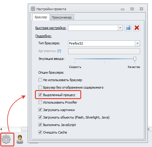 2. В соседнем блоке «Настройки проекта» желательно сразу ставить «галочку» напротив «Выделенный процесс» (отдельный инстанс под каждый браузерный поток, чтобы не могло быть никаких случайный пересечений между разными инстансами даже в теории).