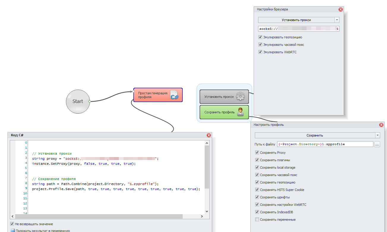 Отдельный шаблон-генератор профилей удобен тем, что можно заранее сгенерировать пачку профилей с нужными параметрами. Сниппет загрузки профиля предназначен для загрузки профиля и донастройки второстепенных параметров браузера.