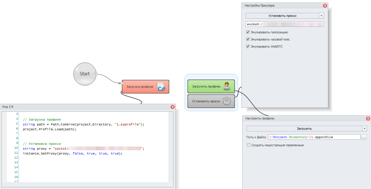 Помимо непосредственно кода или кубика загрузки профиля рекомендую так же устанавливать прокси, как это делалось в шаблоне-генераторе (только тут после загрузки). Почему – если Вы вдруг начнёте использовать, например, backconnect-прокси с регулярно меняющимся внешним IP, то возможна ситуация, когда данные таймзоны и геопозиции нового IP не будут соответствовать данным старого, сохраненного в профиле (хотя, возможно, в последних версиях ZennoPoster этот момент уже учитывается автоматом).