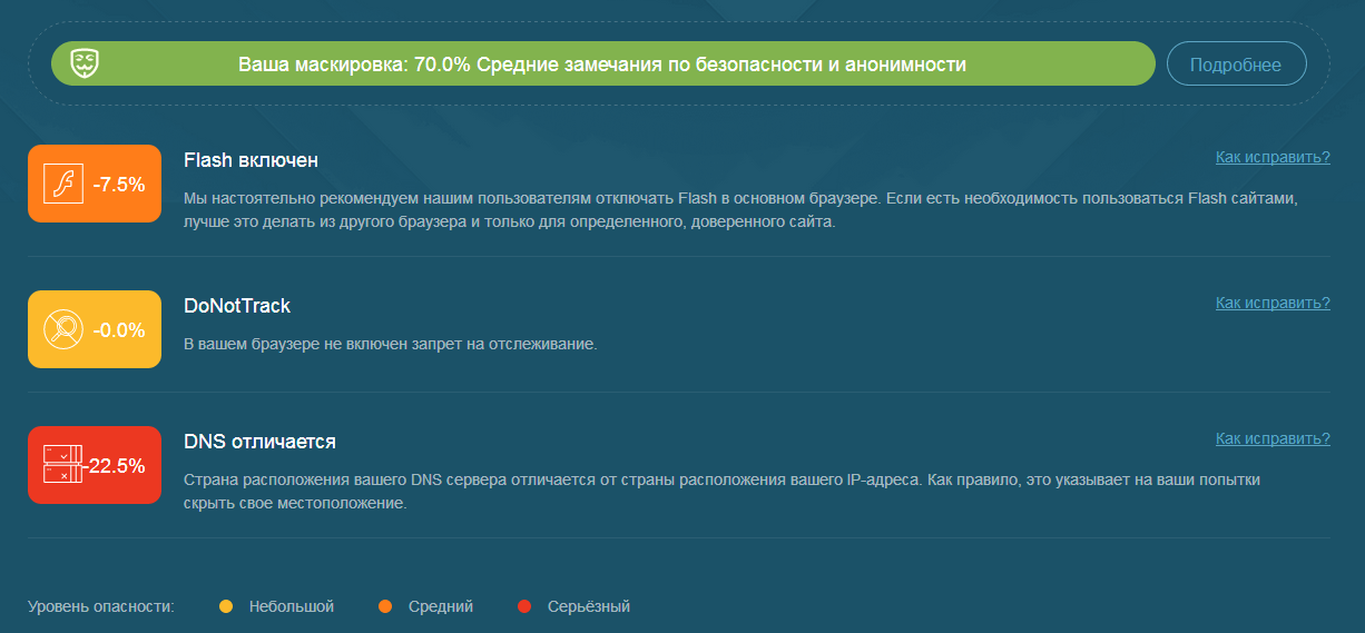 После загрузки профиля нужно проверить, всё ли правильно у нас эмулируется. Существует достаточно много сайтов для этих целей, лично я предпочитаю проверять по следующим 3, в большинстве случаев этого вполне достаточно.