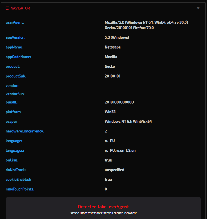 Почему у меня на сайте http://f.vision/ в разделе Navigator постоянно пишет: Установлен фейковый юзер агент. В чем тут фейковость? Mozilla/5.0 (Windows NT 6.1; Win64; x64; rv:70.0) Gecko/20100101 Firefox/70.0 когда это устанавливает сама зенка?