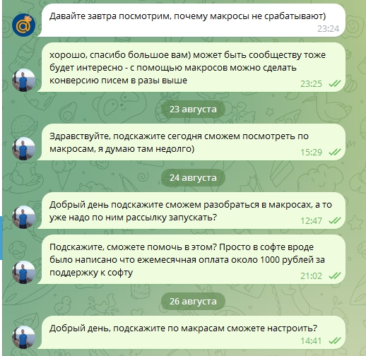 Шлю по B2B, базы собраны в инете, их качество низкое. 50 аккаунтов, 4 мобильные прокси, за 6 часов уходит по 3-6 тыс. 5 дней в неделю, 4 недели в месяц, с апреля по конец октября. Лиды пошли с мая, по нарастающей, объем продаж с нуля до 700-900 тыс в сентябре-ноябре. Другие маркетинговые инструменты не использовались.