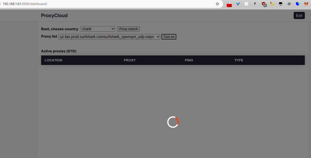 После авторизации в дашборде вы можете выбрать страну (прокси) в выпадающем меню и нажать Proxy Search, а затем выбрать любой из доступных конфигов и нажать Turn On.