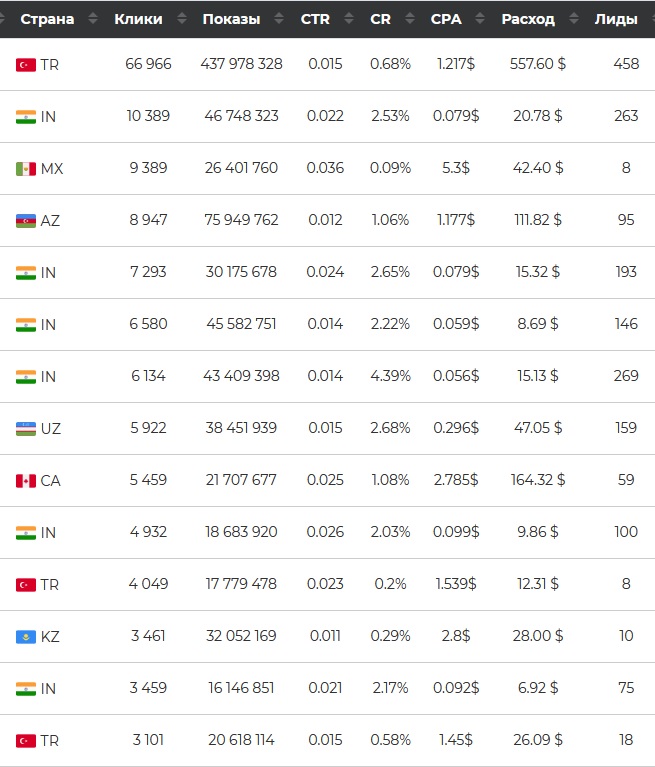 - ТОП стран. Следите за объемами и ценами в популярных ГЕО и создавайте кампании с учетом особенностей.