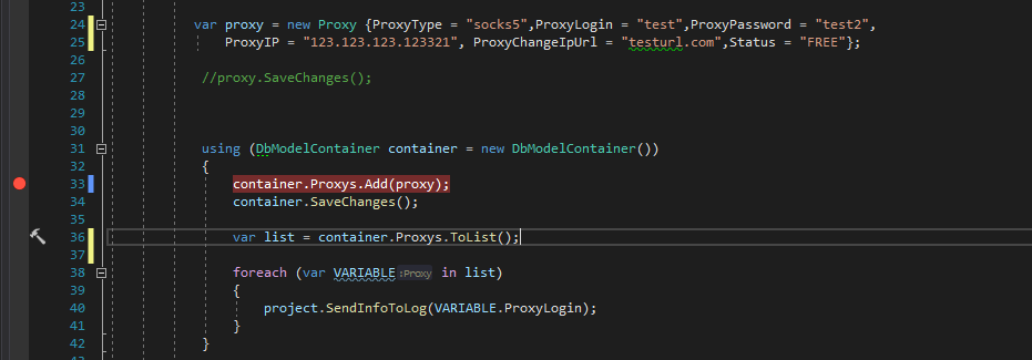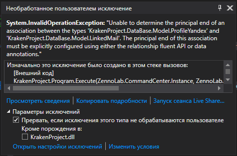 Доброго времени суток, решил тут у проекта работу с бд перевести на EF и столкнулся с проблемой. Сделал я БД на основе модели, все сущности сгенерировались туда сюда, все норм. Пытаюсь добавить тестовые данные в таблицу с прокси, и когда код доходит до помещения экземпляра класса в кэш для дальнейшей записи в БД (точка останова на скрине) то вываливается какой то бред (второй скрин), даже не понятно что за ошибка, мб кто то с подобным сталкивался?
