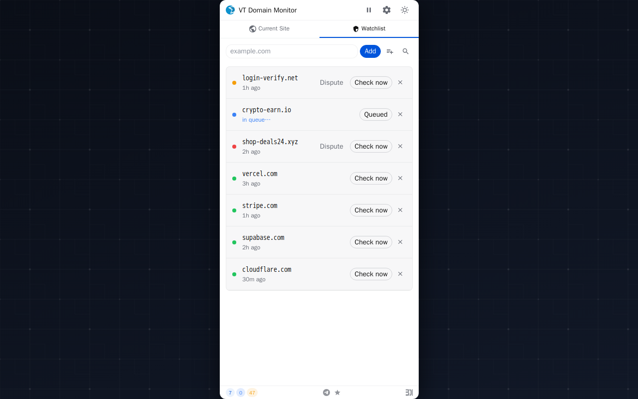 — Текущий сайт: открыл домен — сразу видишь его статус в VT без ручного похода на сайт