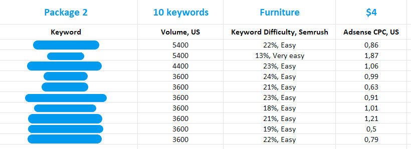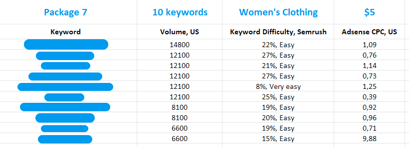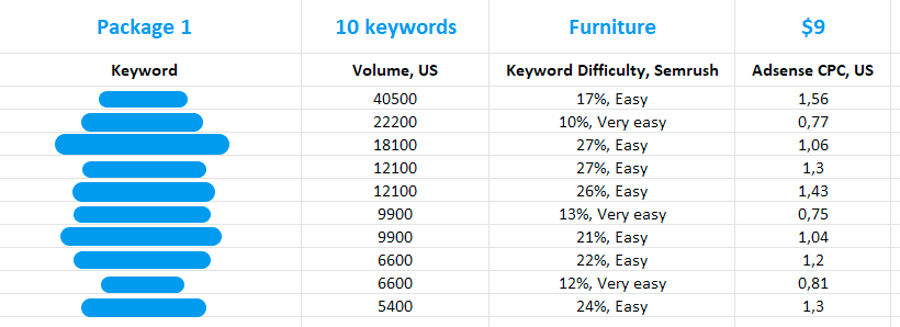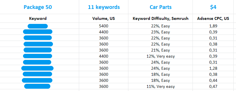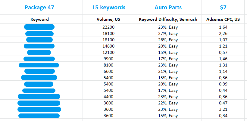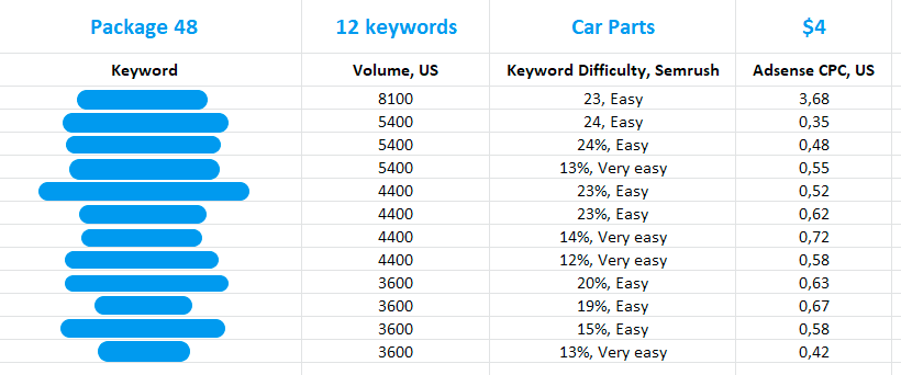 Auto Parts - goods for cars. All these keywords are suitable for creating one website. Competition is low. Niche domain with age and backlinks is needed. You can write a description of one product or a list of several products for each keyword with pictures and videos.
