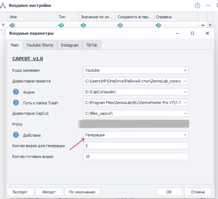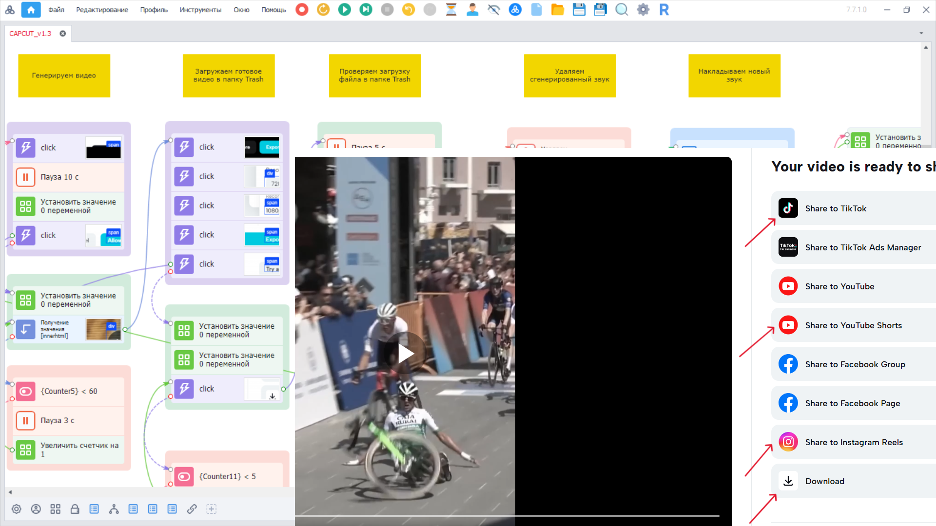В режиме "Генерация" шаблон запускается с указанием количества требуемых роликов. Отличительной особенностью моего шаблона является то, что видео сразу не выгружаются в социальные сети. Дело в том, что CapCut AI Video Generator часто повторяет одну и ту же аудиодорожку, и она может быть уже распространена в сети. Чтобы решить эту проблему, я написал несколько скриптов на Python, которые автоматизируют процесс уникализации аудио.