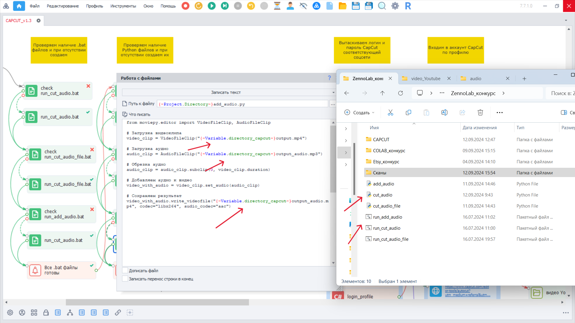 В начале статьи я уже упоминал, почему видео не выгружаются автоматически. Напомню, что аудиотреки, используемые в CapCut AI Video Generator, часто повторяются, и это может негативно сказаться на восприятии контента в соцсетях. Поэтому для повышения уникальности видео, шаблон продолжает его обработку с помощью Python-скриптов. Знание языка программирования не требуется, так как шаблон автоматически создаёт и настраивает скрипты, а также соответствующие BAT-файлы для их запуска.