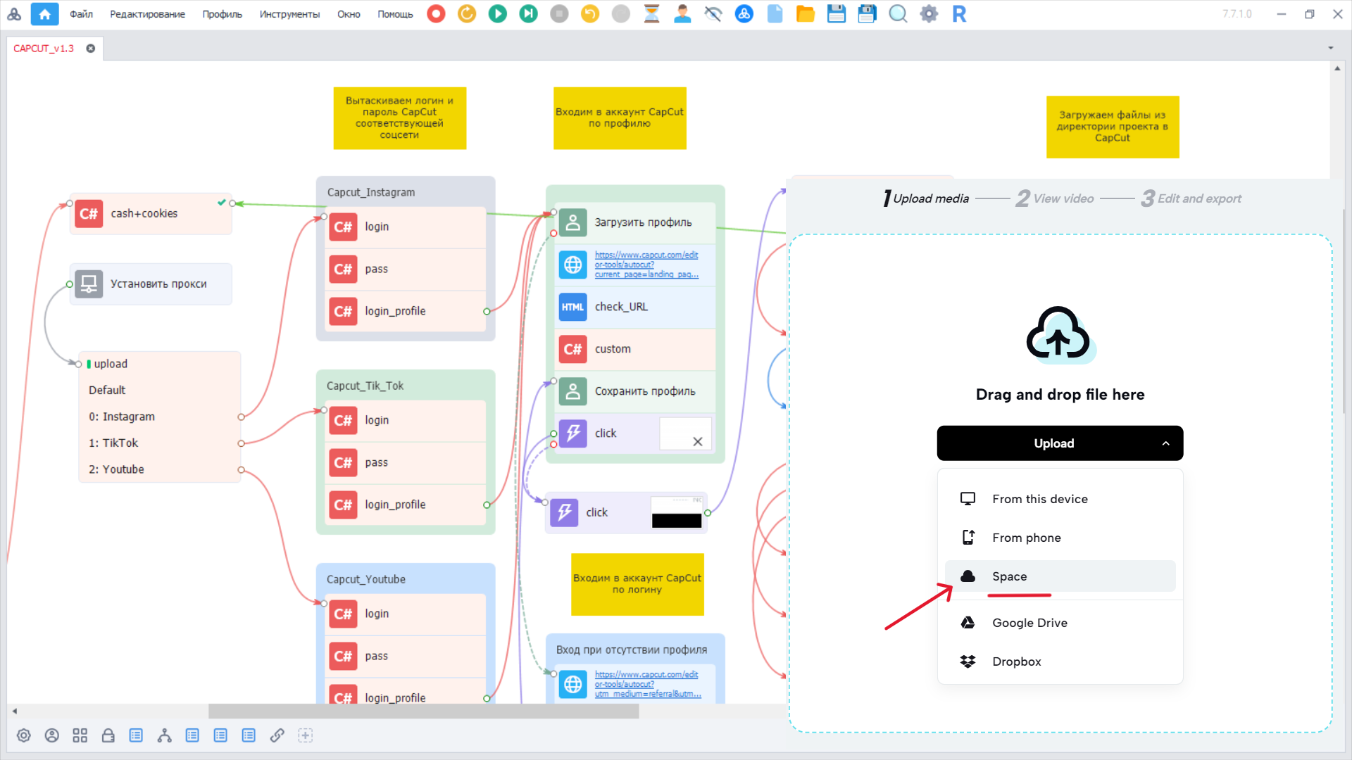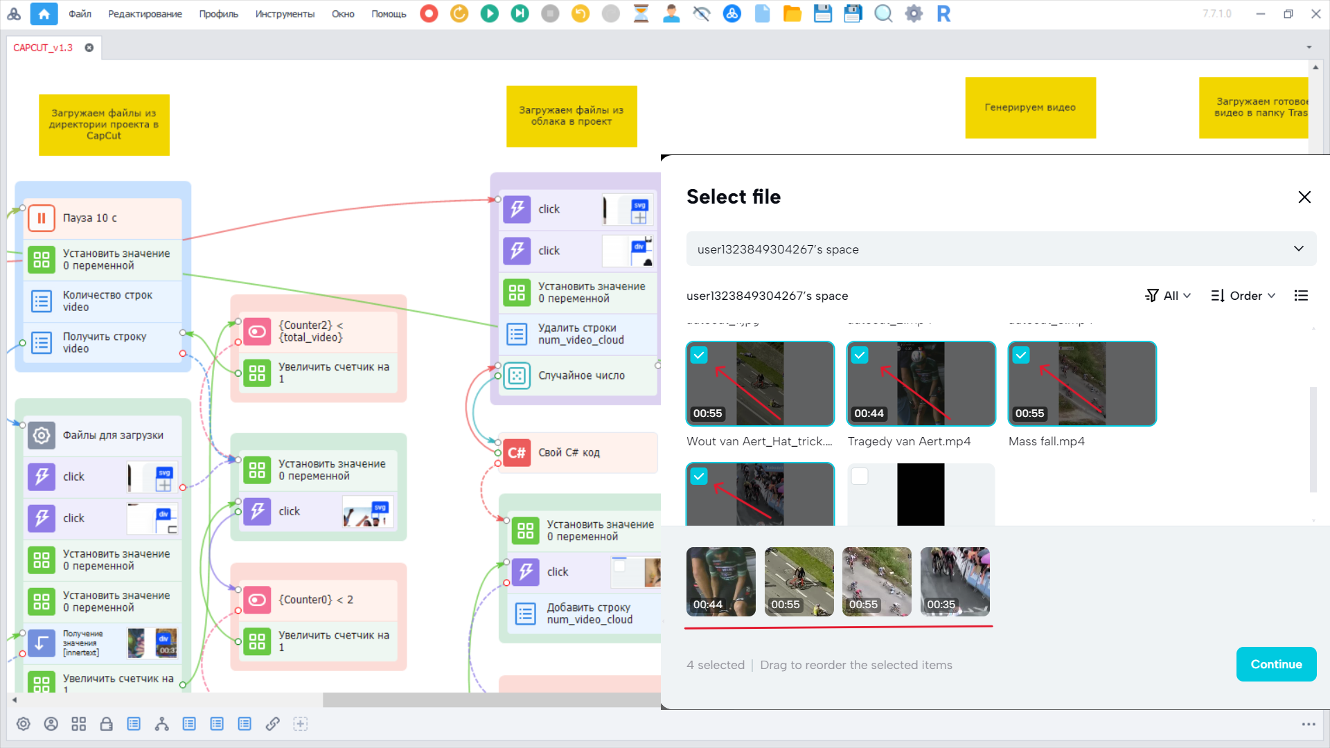 Шаблон рандомно выбирает поочередно указанное в настройках количество видеороликов из облака, одновременно удаляя три стандартных шаблона, предлагаемых CapCut, которые нам не понадобятся. Хотя можно было бы загружать видео напрямую из директории проекта, этот процесс занимает больше времени. Выбор видео из облака значительно ускоряет работу и делает процесс генерации более эффективным.