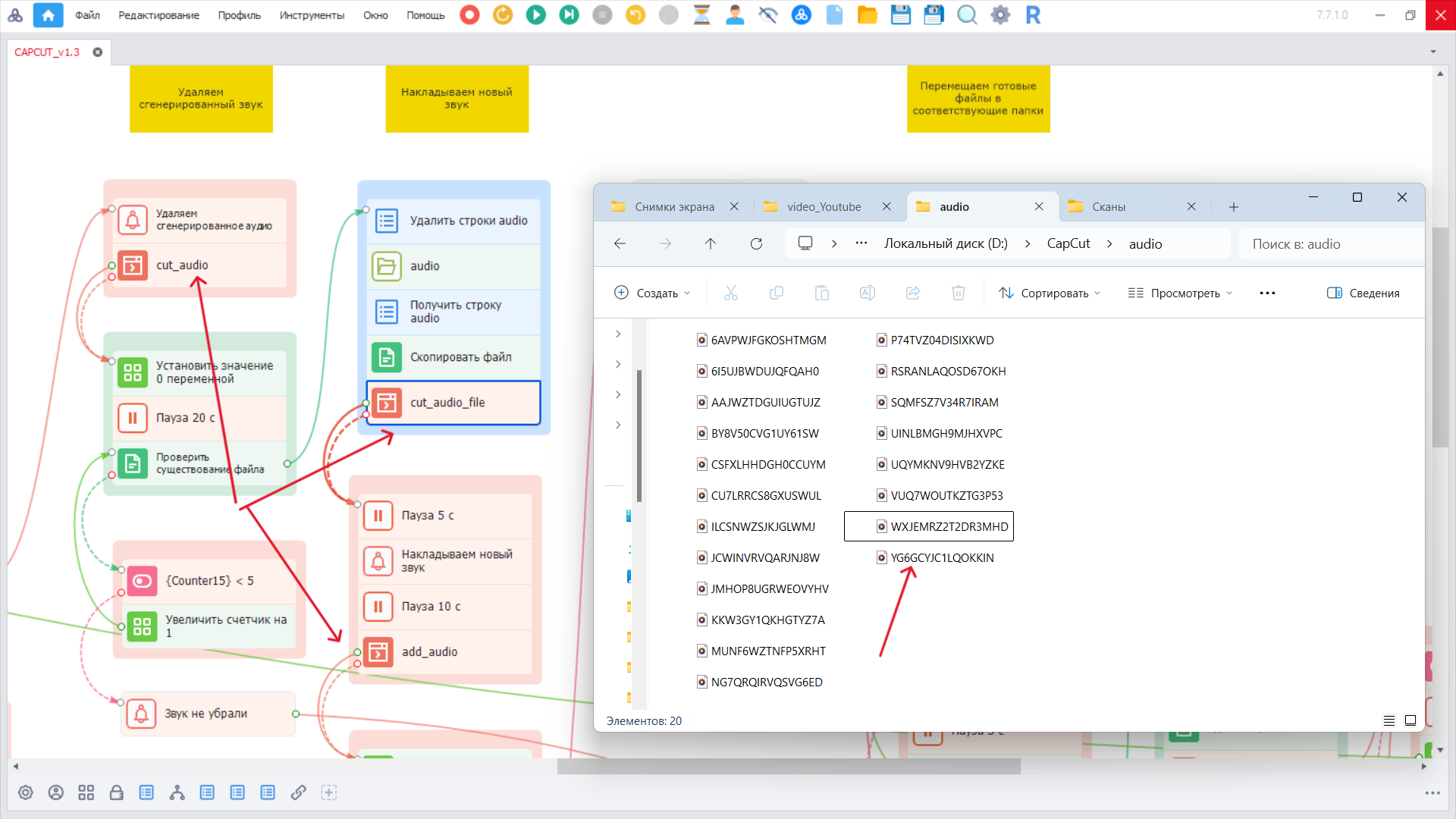 Сначала скрипты удаляют сгенерированное аудио, затем выбирают случайный звуковой файл из заранее подготовленной папки с аудиодорожками. После этого происходит рандомная нарезка 20-секундного отрезка из выбранного аудио, который накладывается на сгенерированное видео. Это позволяет не только избежать повторов, но и сделать видео ещё более уникальным, что повышает шансы его успешного продвижения в соцсетях.