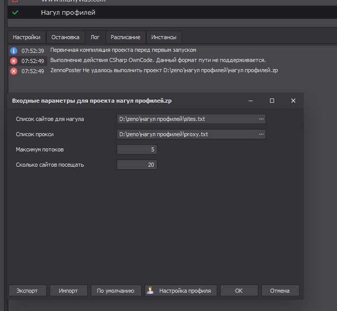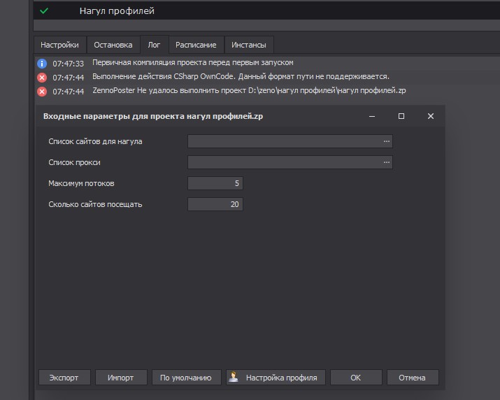 11:43:16 ZennoPoster Не удалось выполнить проект C:\Users\Руслан\Desktop\Проекты\Нагул\нагул профилей (1).zp