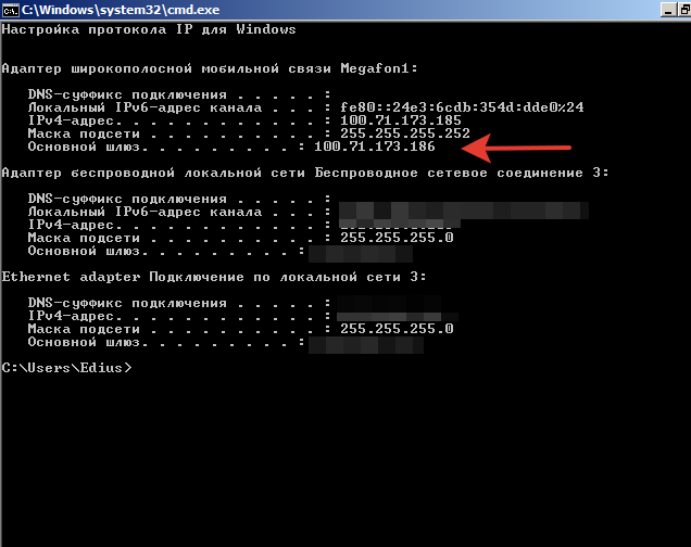 Настройка протокола IP для WindowsАдаптер Ethernet Megafon1: DNS-суффикс подключения . . . . . : Локальный IPv6-адрес канала . . . : fe80::99a0:1f41:ade9:5aec%7 IPv4-адрес. . . . . . . . . . . . : 192.168.8.100 Маска подсети . . . . . . . . . . : 255.255.255.0 Основной шлюз. . . . . . . . . : 192.168.8.1Адаптер Ethernet Ethernet: DNS-суффикс подключения . . . . . : IPv4-адрес. . . . . . . . . . . . : 192.168.1.36 Маска подсети . . . . . . . . . . : 255.255.255.0 Основной шлюз. . . . . . . . . : 192.168.1.1