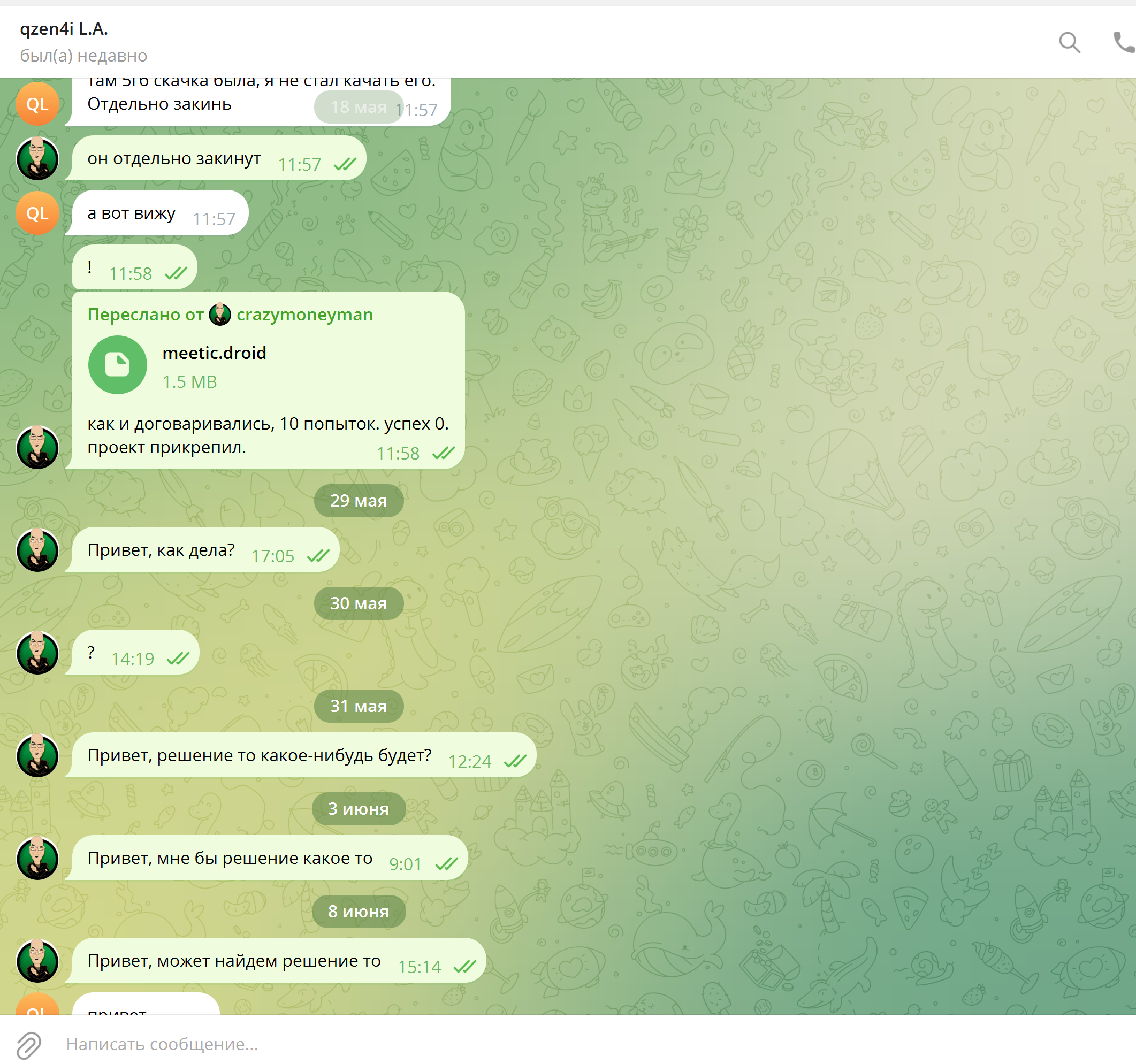 Обратился я к нему 28 марта. оплату произвел 29. Я понимаю что шаблон может изначально показатся простым, но когда начинаешь его делать встречаются трудности. Мне сказали что возомжно на 4-5 дней мы задержимся по срокам. Я вхожу в положение, и все прекрасно понимаю. 6 апреля отправляют мне мой проект, и говорят погонять его в проджектмейкере. Я не использовал ранее ZenoDroid и принялся за оплату и всего остального. Может я что то не так делал, но мему крашилась постоянно, в рандомных моментах, стабильности у шаблона не увидел. И сообщил об этом. Мне сказали что проблему нужно исправлять на моей стороне, у меня компьютер другой, и шаблон по другому на нем работает. И вот ко мне подключились по анидеску, и весь рабочий день, я смотрел как он делает этот шаблон, и когда он останавливался, я писал и напоминал ему, что нужно наверно что то сделать, чтобы дальше пошло. меня по тихонечку пытались сливать, давая понять, что дел очень много. Мы еще стараемся найти решение данной проблемы, но видимо сил у него не хватает. Он предлагает мне решение. "Давай я напишу тебе шаб на зенопостере, ты закидываешь мне вторую часть. по итогу ты остаешься с двумя проектами, а я со своими заработанными." Ну думаю круто. Давай. Я закинул вторую часть. Мне ответили что кнопки найти не могут в зеннопстере, и придется делать в зенодроиде. бум, второго проекта получается не будет. И мы снова возвращаемся в мему, и ему нужен именно мой компьютер, для редактирования шаблона, так как на его стороне как он утверждал все работает. у меня столько времени нет, чтобы сидеть и ждать пока человек за деньги на кнопочки решит нажать занимая мой пк. мы договорились, что если из 10 попыток его шаблон показывает успех, будем считать его рабочим, в противном случае, он его доделывает, чтобы он работал. Я отправляю ему как и договорились, видео с 10 попытками этого шаблона, не одна из них не увенчалась успехом. он не стал качать видео. сказал что слишком много оно весит. Когда я попросил его предоставить видео как у него все работает, то видео я не получил. он сказал что доработает, но после даже не писал. я искал его почти неделю, и он не читал мои сообщения. но как только я написал ему с другого аккаунта, ответ сразу же был. Не знаю, как тут такое решается. Со своей стороны, могу предоставить все скрины переписок и прочее. Мне бы деньги вернуть конечно, ну или шаблон по этим же критериям.