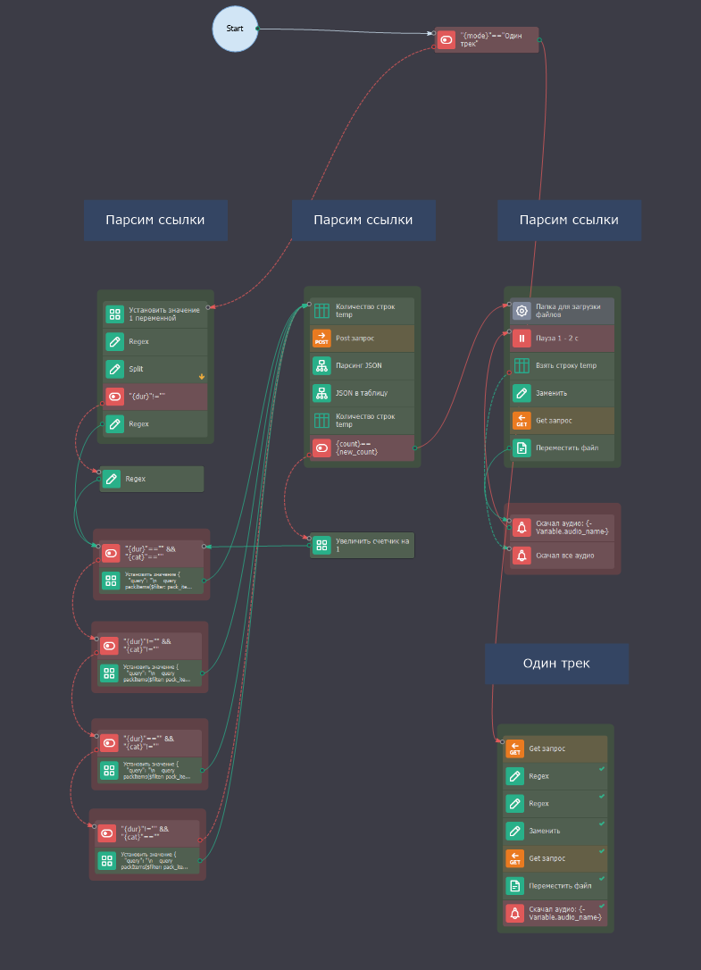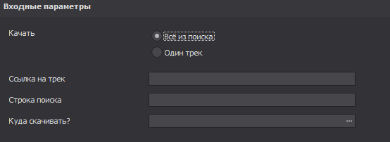 Первым делом переходим на этот сайт . Нам открывается список постов с трендовой музыкой, просто так в браузере её можно только послушать, а скачивать можно только с премиум доступом. Итак, первый вариант работы: выбирает понравившийся трек, переходим к этому посту (пример ссылки: ) и копируем url адрес. Вставляем в входных в шаблон в поле "Ссылка на трек", выбираем режим работы "Один трек", указываем папку, в которую будет скачиваться и запускаем шаблон. Через пару секунд, трек будет в папке. Второй вариант - это уже работа с фильтрами поиска и скачиванием вообще всех треков по фильтрам. В шаблоне работа предусмотрена только с категориями и длительностью аудио трека. Поэтому настраиваем фильтры и копируем ссылку, вставляем её в входных в поле "Строка поиска" , указываем папку, в которую будет скачиваться и запускаем шаблон. Он скачает все треки по этой ссылке.