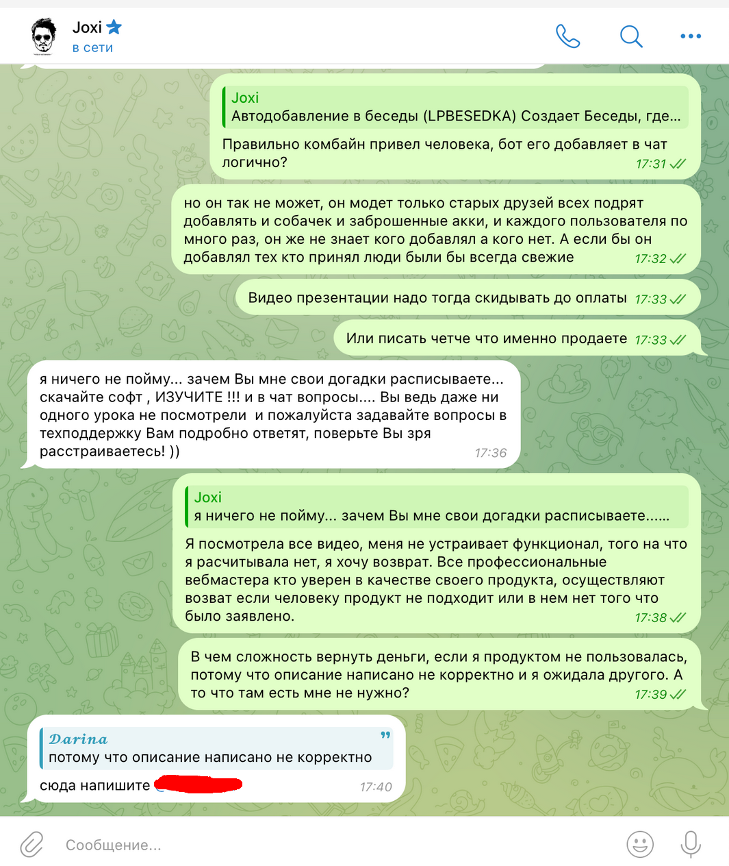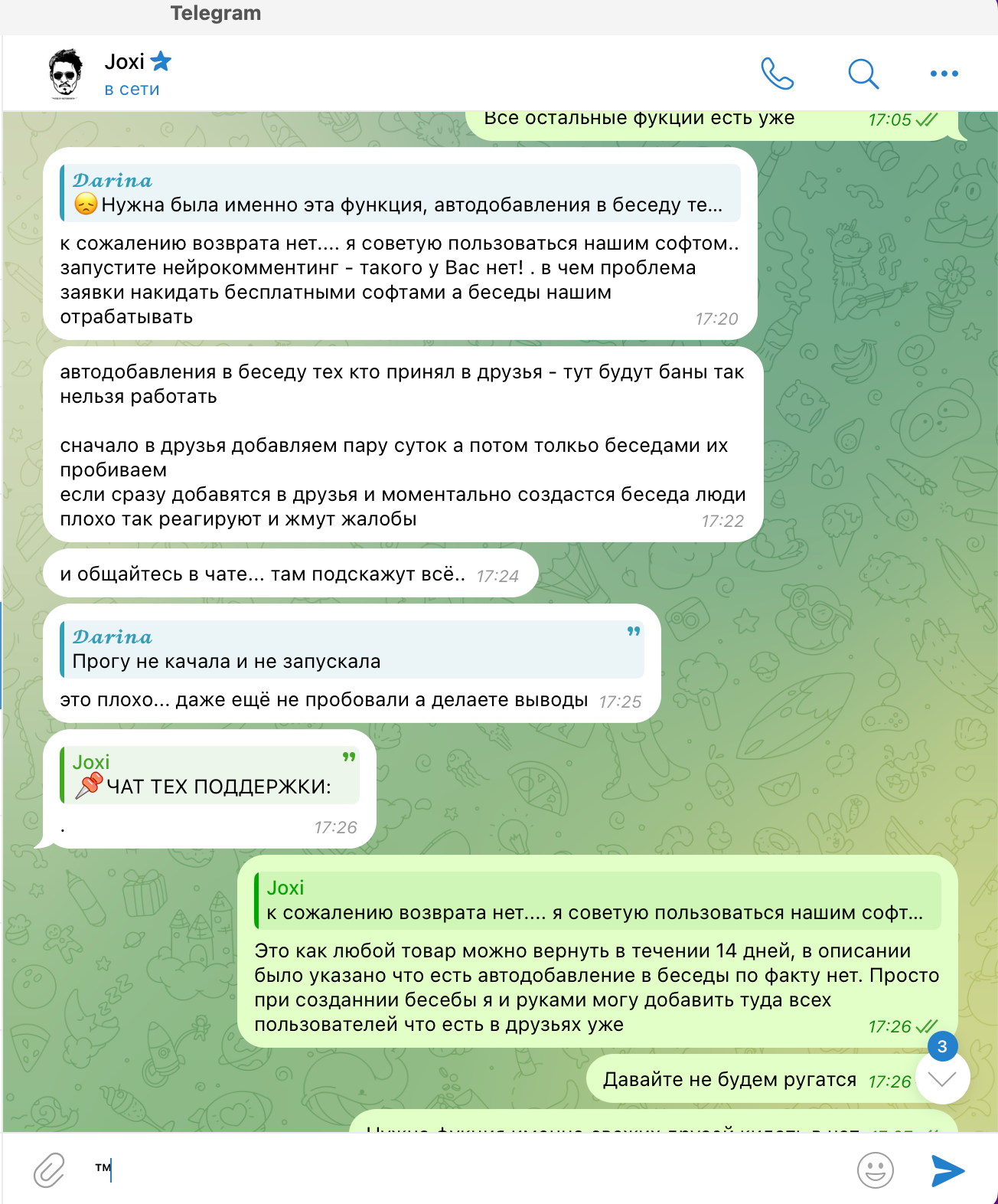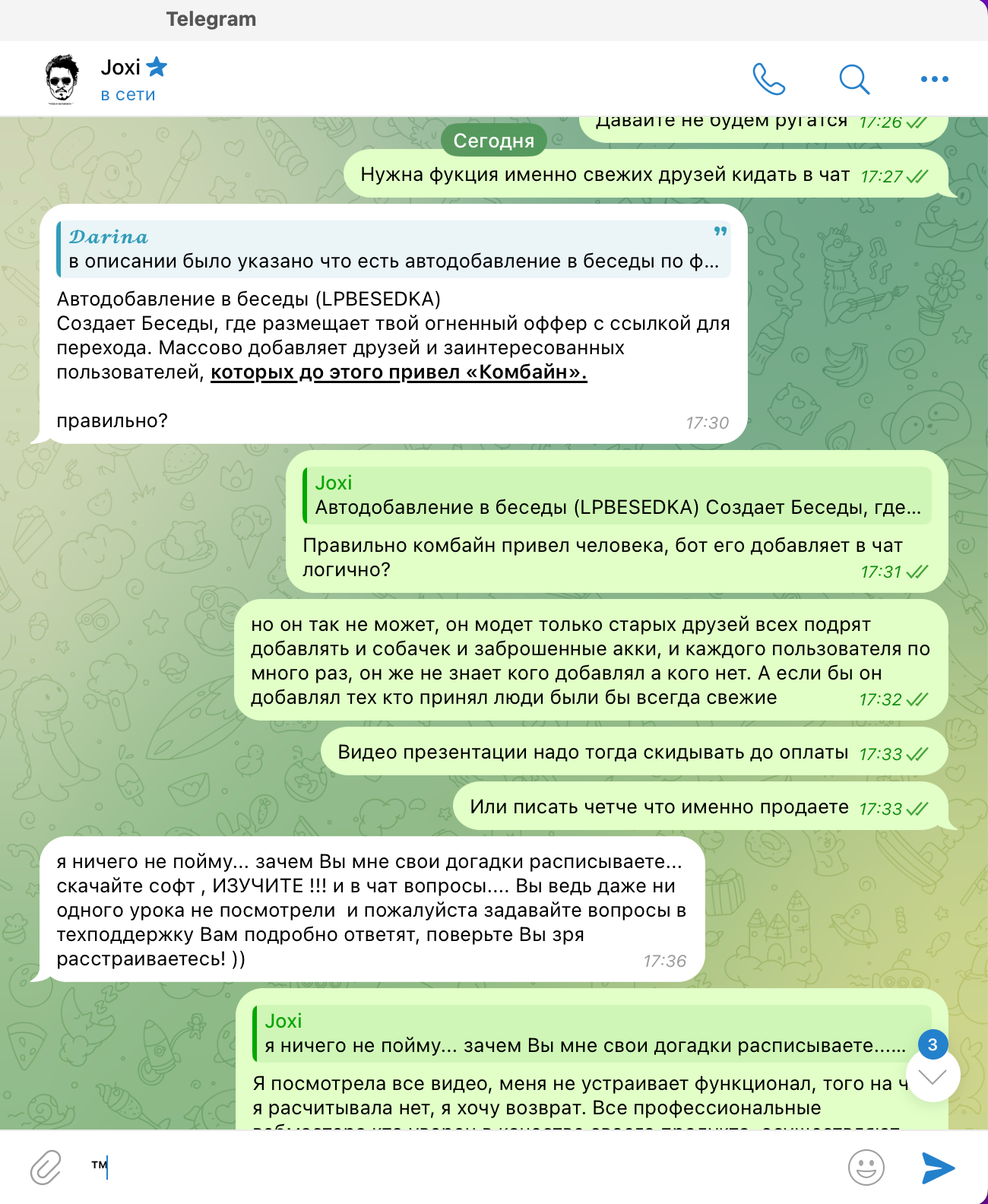 Так вы мне сами сказали что функции которая мне нужна нет, а те что есть мне не нужны. Единственно что мне было нужно, свежепринятых друзей собирать в беседу на этом все, ради этого ПО приобреталось, все остальные функции у меня есть в более удобном сервисе, о чем я вам кстати говорила. В чем сложность сделать возврат одной копии программы я не понимаю, при том что я ее даже не активировала. В чем сложность писать описание правильно, показывать виедопризентацию ДО оплаты?