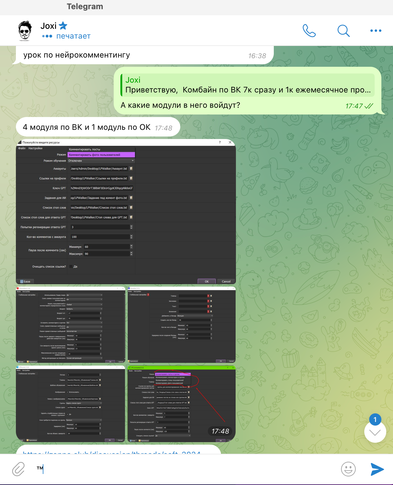 Всем привет, приобрела комбайнер для Вконтакте. Сразу после оплаты выдали доступ и чаты. Посмотрела видео уроки за 3 часа и сразу запустила рассылку обьявлений по группам. Всё работает, комбайнер очень удобный и понятный. На вопросы каждый день отвечают в чате. Буду еще пробовать нейрокомментинг. Очень полезное приобретение, которое генерирует деньги в интернете.