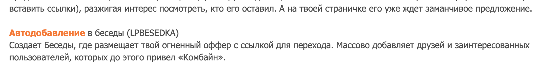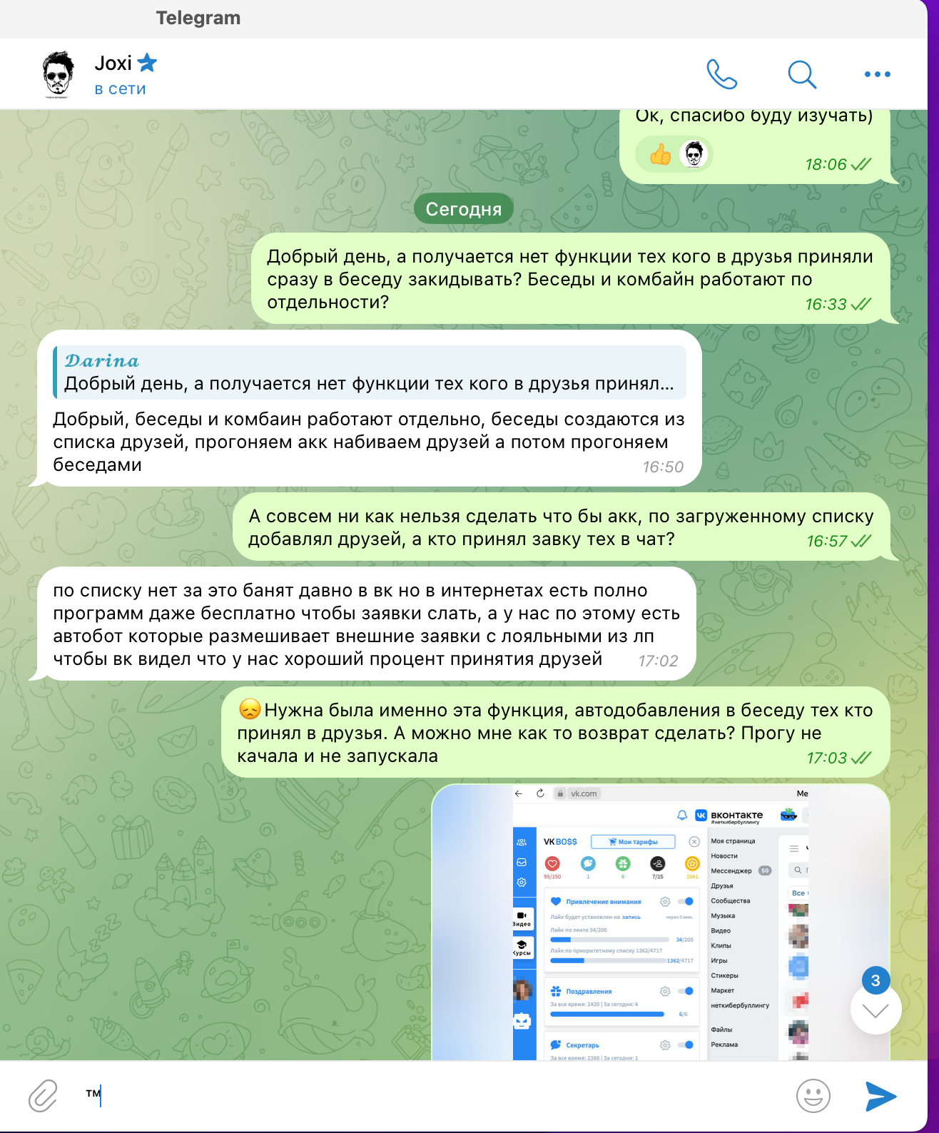 ТС вводит в заблуждение описанием программы. В описании указано что ПО "добавляет в беседу в вк людей которых привел комбайн". Из этого выходит логичный вывод что есть функция автоматически добавлять в друзья, автоматически добавлять в беседу при принятии в друзья, что мне было и нужно.