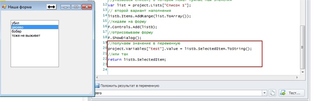 project.Variables["test"].Value = listb.SelectedItem.ToString();