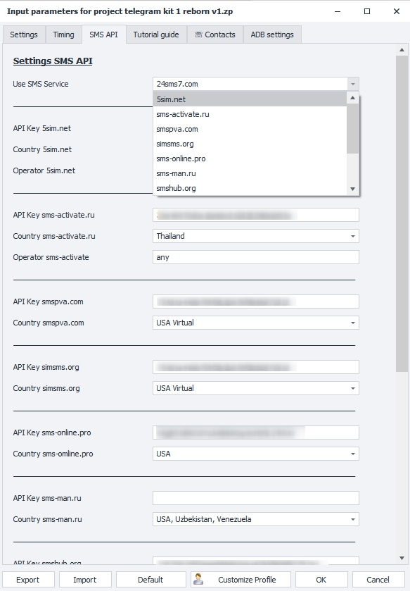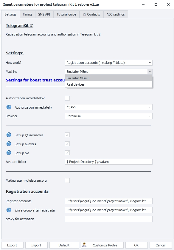 Telegram kit 1: reborn - может регистрировать телеграм аккаунты в различных форматах, для самых популярных программ представленных на рынке телеграм софта - .tdata, .session, .json, .zpprofile. Создаёт автоматически АПИ токен (пары) api id и api hash, прогревает аккаунты - ставит аватары, вступает в группы и каналы, заполняет био. Поддержка 10 популярных смс провайдеров, дешёвые номера всегда в наличии, поддержка прокси, работа в многопоточном режиме (регистрируйте сразу на нескольких устройствах одновременно).Может регистрировать на реальных андроид смартфонах или же на виртуальных андроидах через эмулятор. Программа не использует телеграм АПИ, за счёт чего все аккаунт имеют высокий траст по сравнению с авторегами открытыми по АПИ, которые телеграм блокирует пачками.