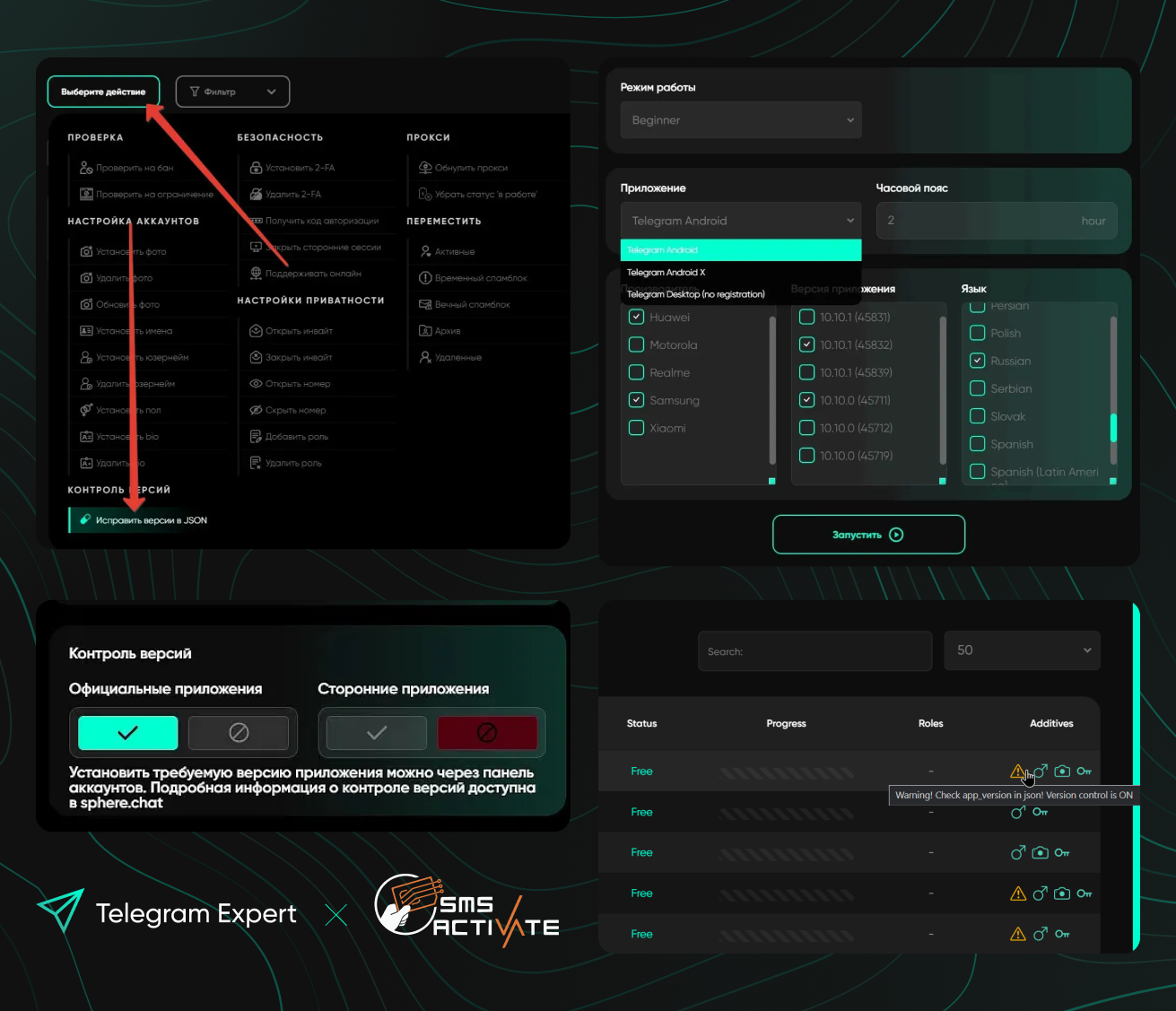 Позволяет в автоматическом режиме регистрировать аккаунты Telegram дабы использовать их для своих нужд. Поддерживает API ключ целого ряда сервисов SMS активации.
