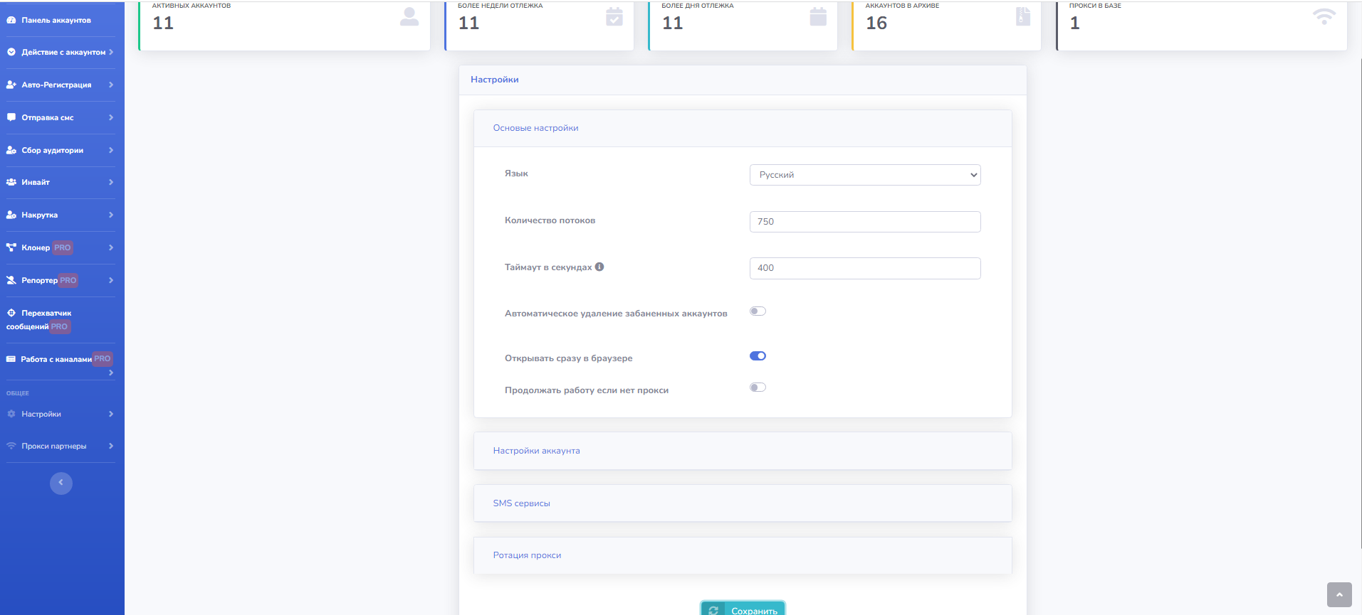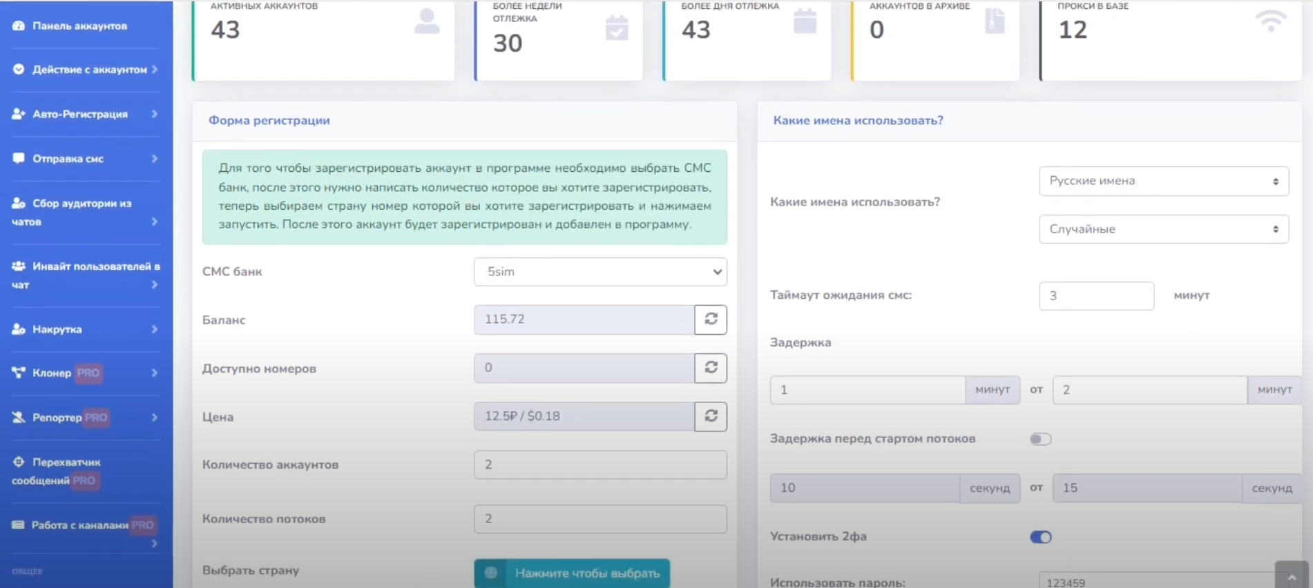 Поддерживаются практически все СМС-сервисы. Если не приходит долго код - номер автоматически отменяется. Можете просто указать, что вам нужно 100 аккаунтов, программа сама зарегистрирует, подгрузив аватарки, фамилию имя и био, как по вашему желанию так и из нашей базы.