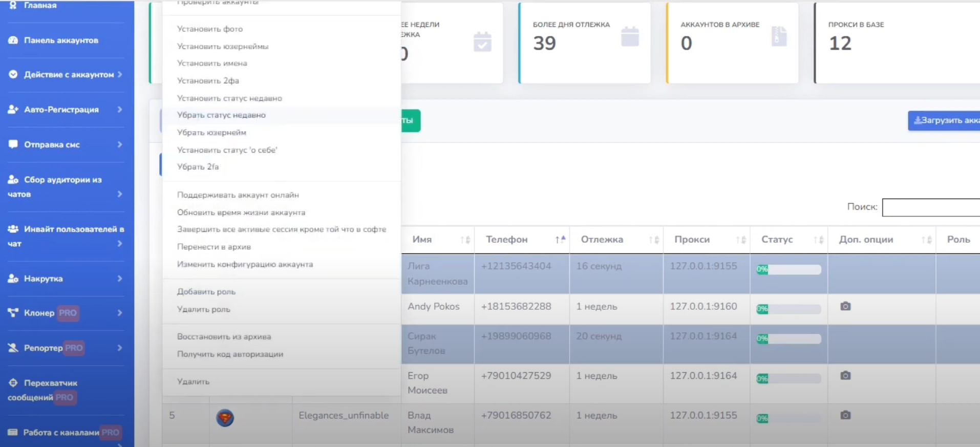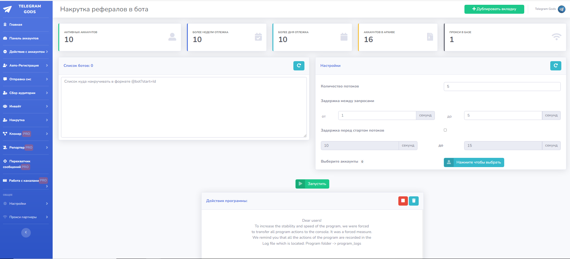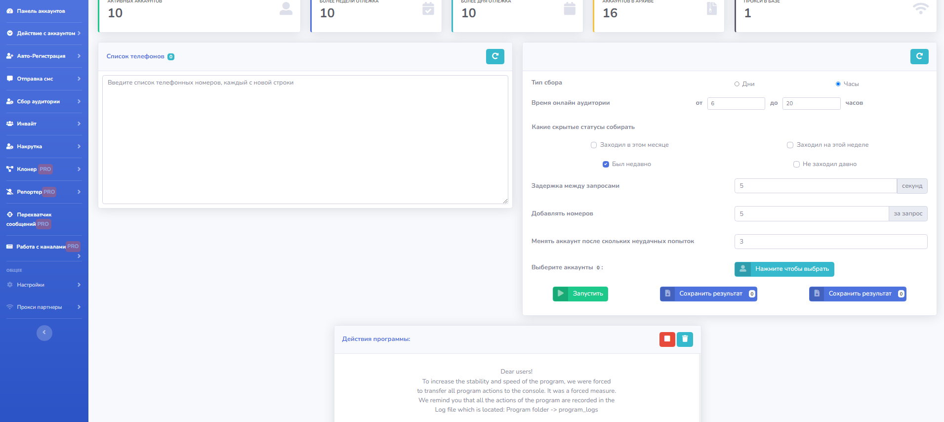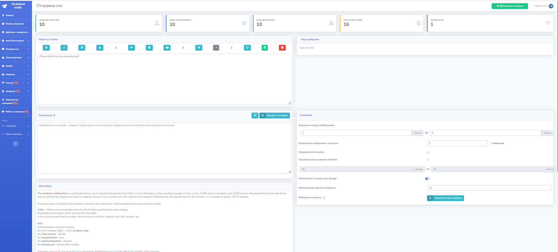Это раздел предназначен для работы с аккаунтами. Много функций по работе с ними, установка bio, аватаров, юзернеймов, Имени-Фамилии, установка 2fa проверка аккаунтов из выбранных на спамблок и бан, так же во вкладке аккаунты указано время отлежки каждого конкретного аккаунта.