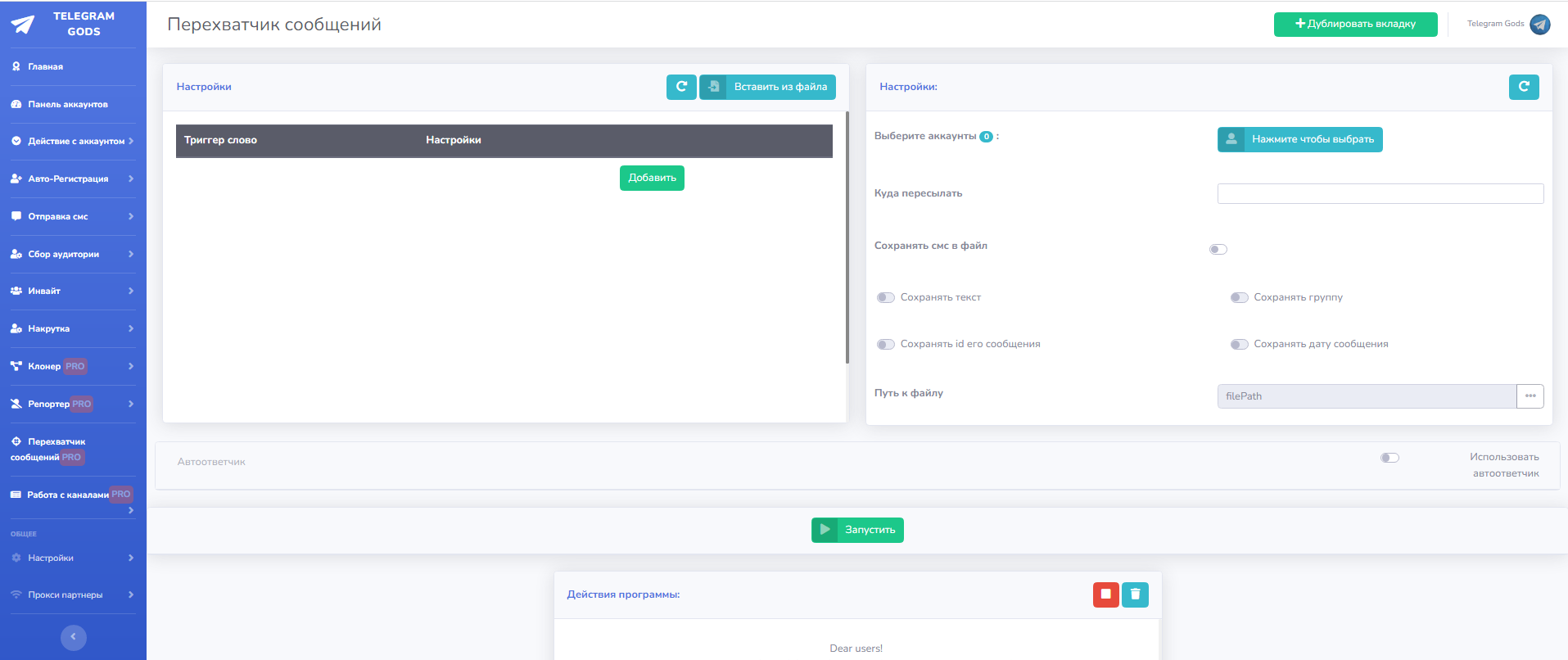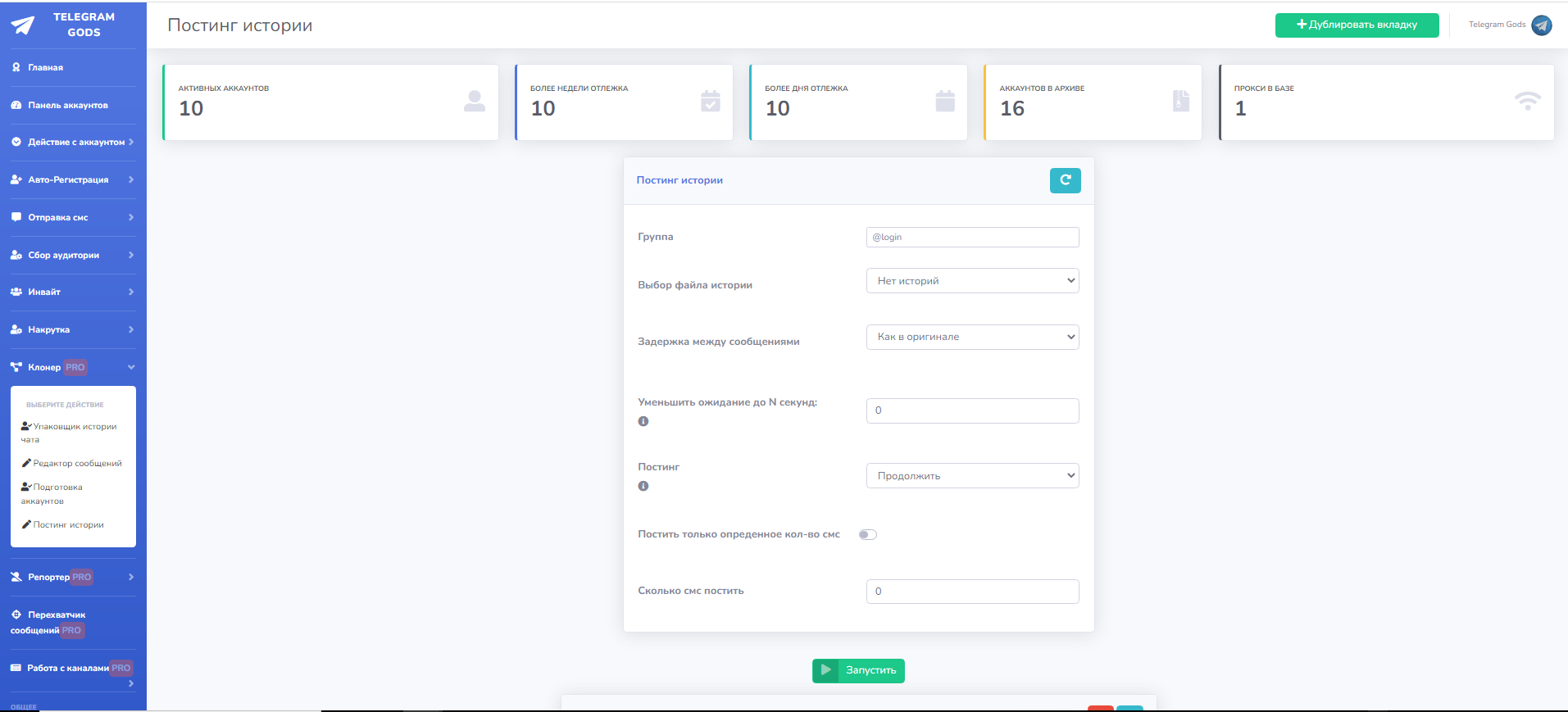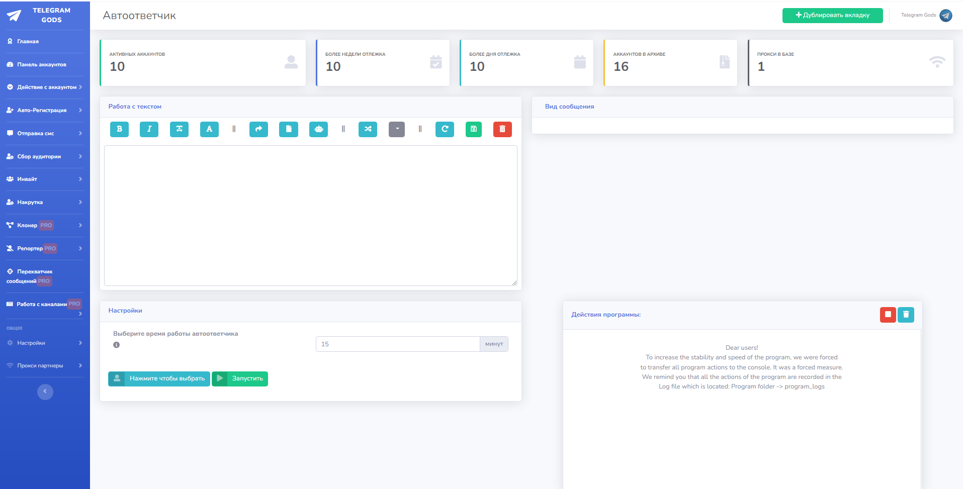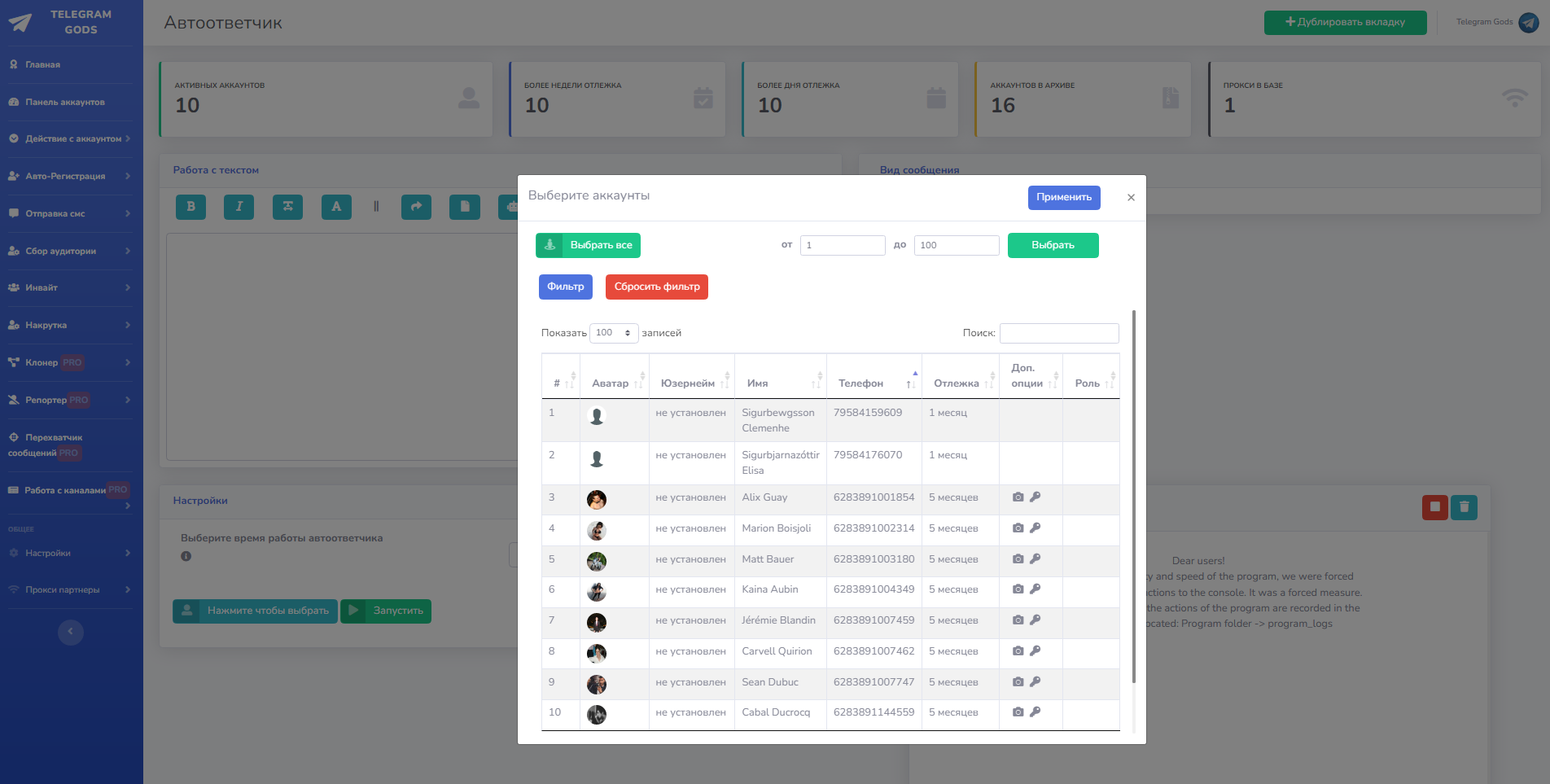 Это раздел предназначен для работы с аккаунтами. Много функций по работе с ними, установка bio, аватаров, юзернеймов, Имени-Фамилии, установка 2fa проверка аккаунтов из выбранных на спамблок и бан, так же во вкладке аккаунты указано время отлежки каждого конкретного аккаунта.