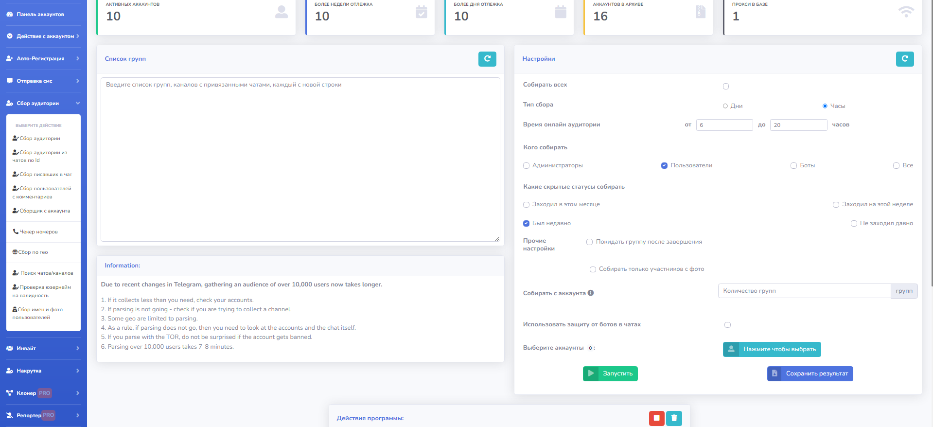 Парсер групп умеет работать и с приватными ссылками. Просто указываем сколько нам нужно групп, в фильтре справа указываем какая нам нужна аудитория (например интересуют только самые активные). Запускаем и программа собирает все юзернеймы.