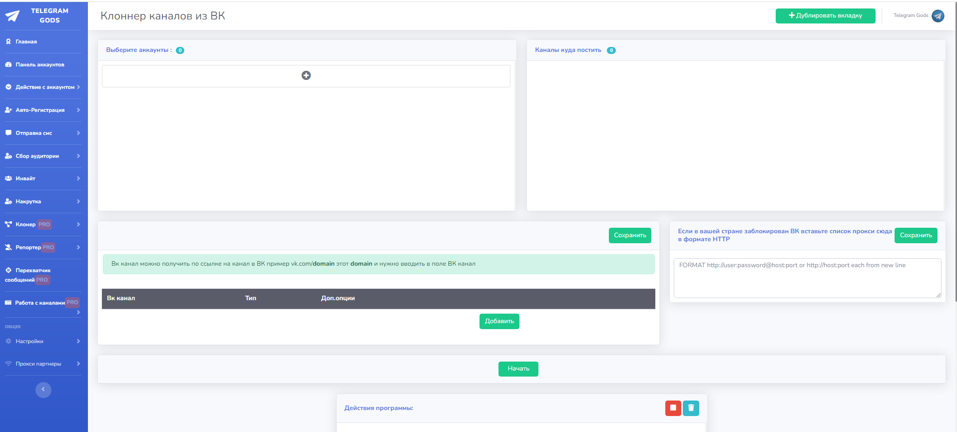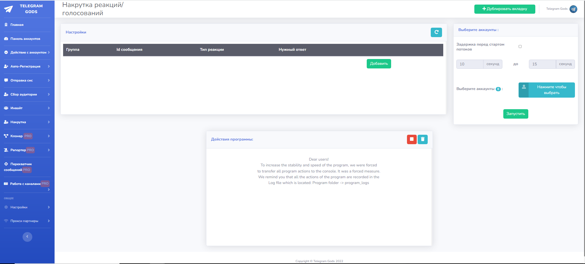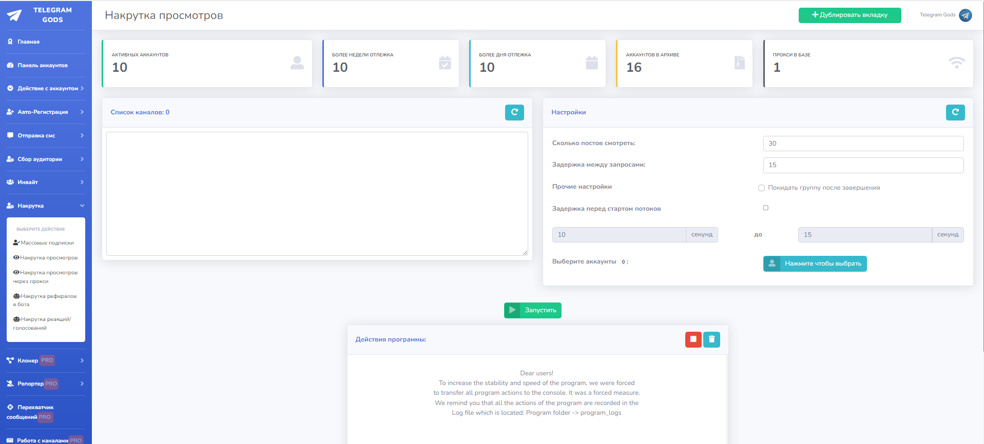 Программа работает в многопоточном режиме(выполняет много действий за раз), а так же вы можете запустить все функции сразу, например накрутку , рассылку , инвайт и т.д. Так же программу можно запускать в несколько окон.