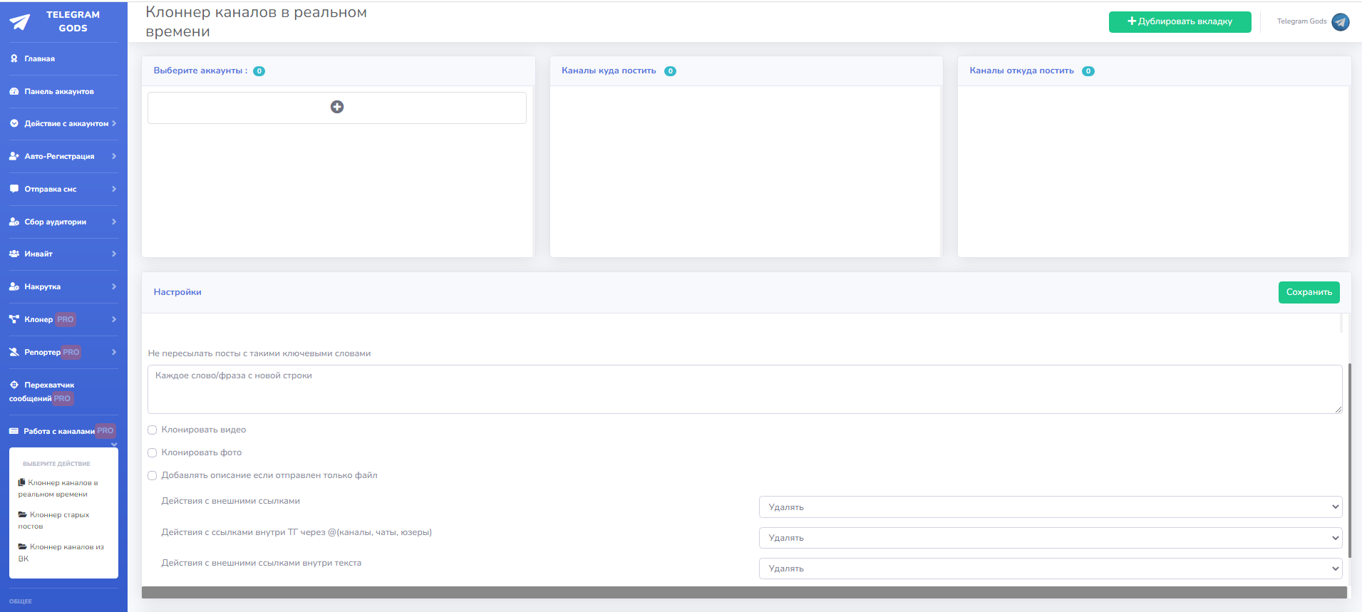 2)Клонирует в режиме онлайн транслятора новые посты.