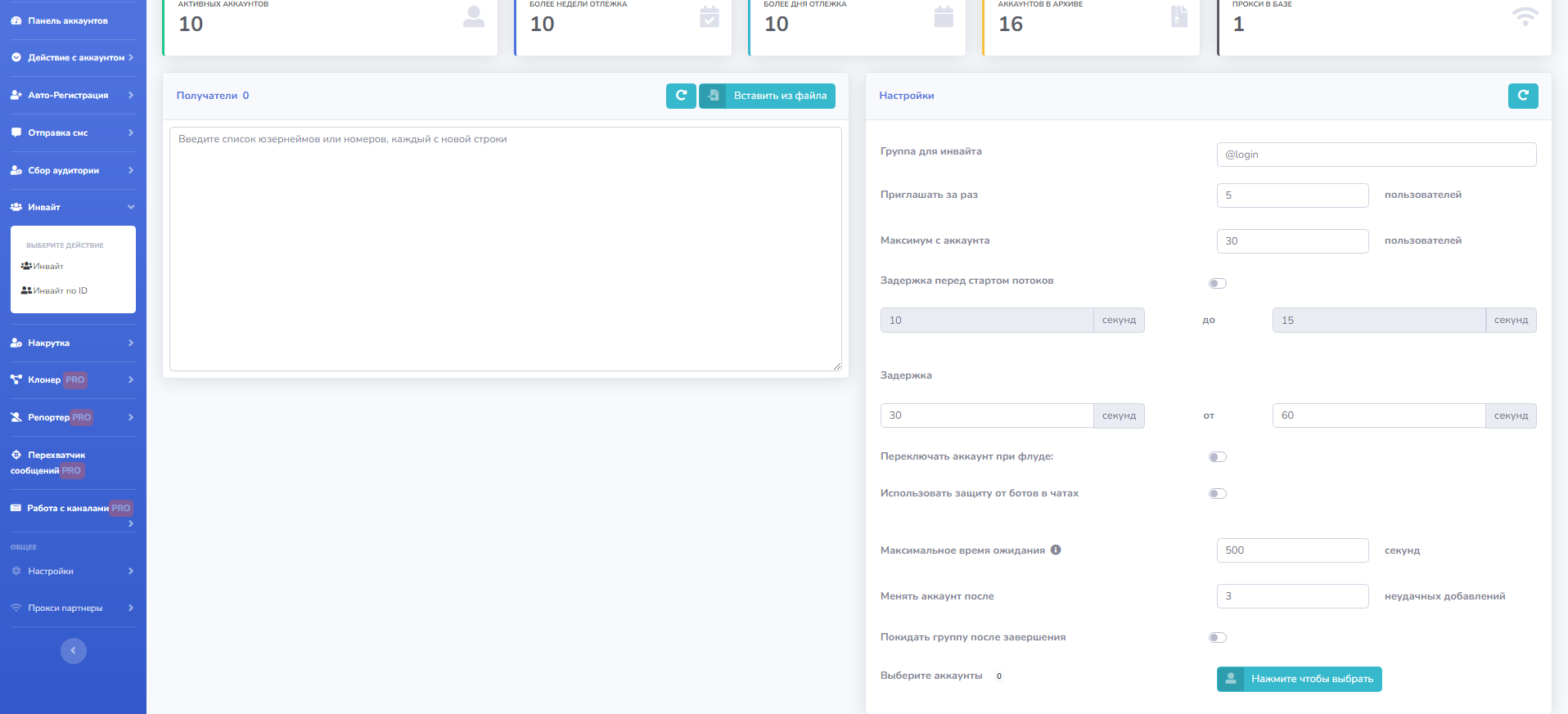 Позволяет приглашать в чат пользователей из собранных вами списков. Услуга весьма востребована, интерфейс страницы инвайтера так же имеет все необходимые настройки. Настройки просто шикарны и очень широкие.