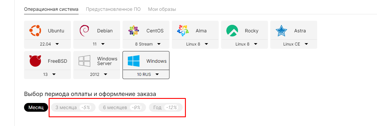 Доступны любые ОС: Windows10/Windows Server, Debian, Ubuntu, CentOS, RockyLinux, AlmaLinux.